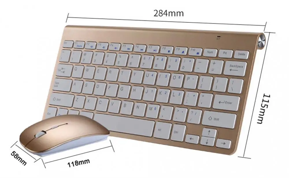 Slim wireless keyboard and mini optical mouse set with USB receiver.