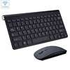 Slim wireless keyboard and mini optical mouse set with USB receiver.