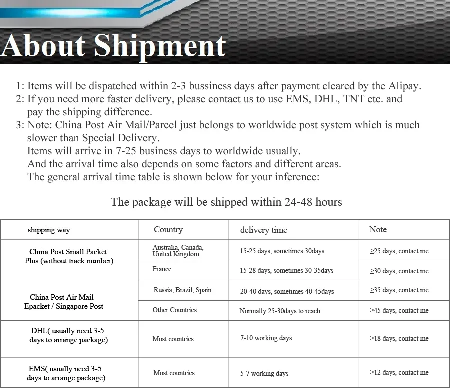 Orders are shipped by EMS or USPS. Typically, delivery takes 5-20 working days after dispatch, but it may take longer due to factors beyond our control.