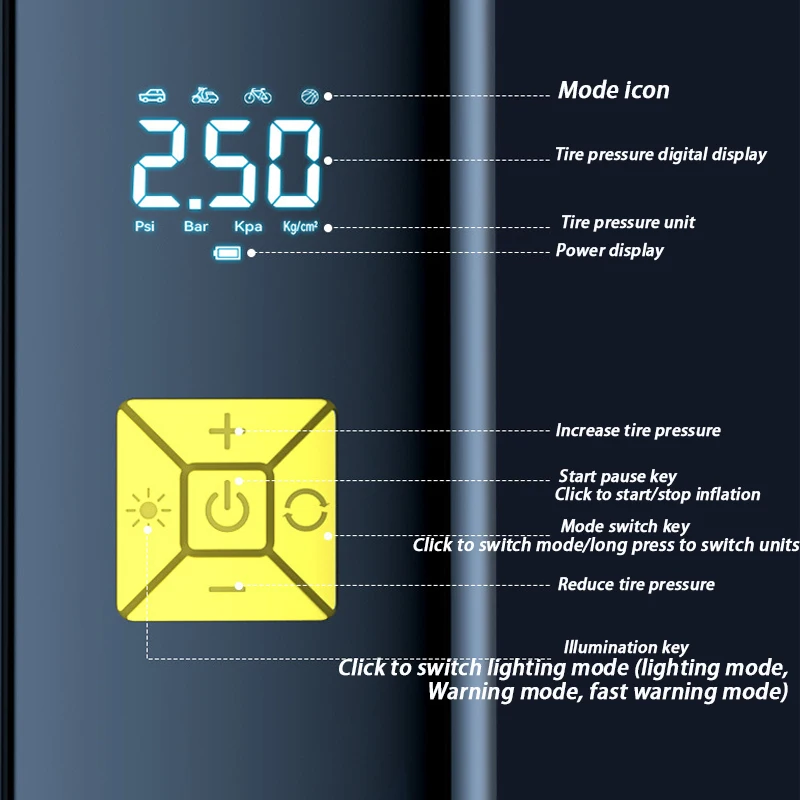 1. Accurate tire pressure: The inflation pump can measure and display the accurate tire pressure, helping users inflate the tire to the appropriate pressure range to ensure safety and optimal performance.