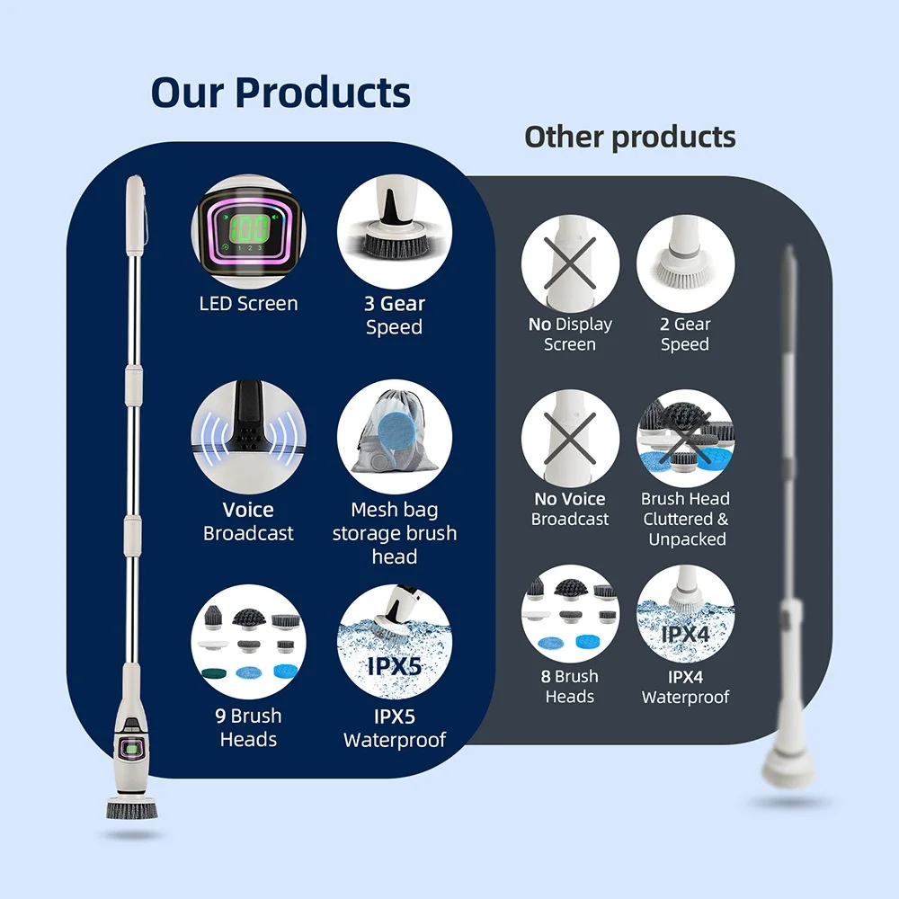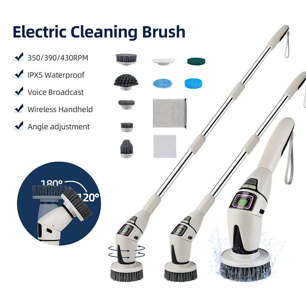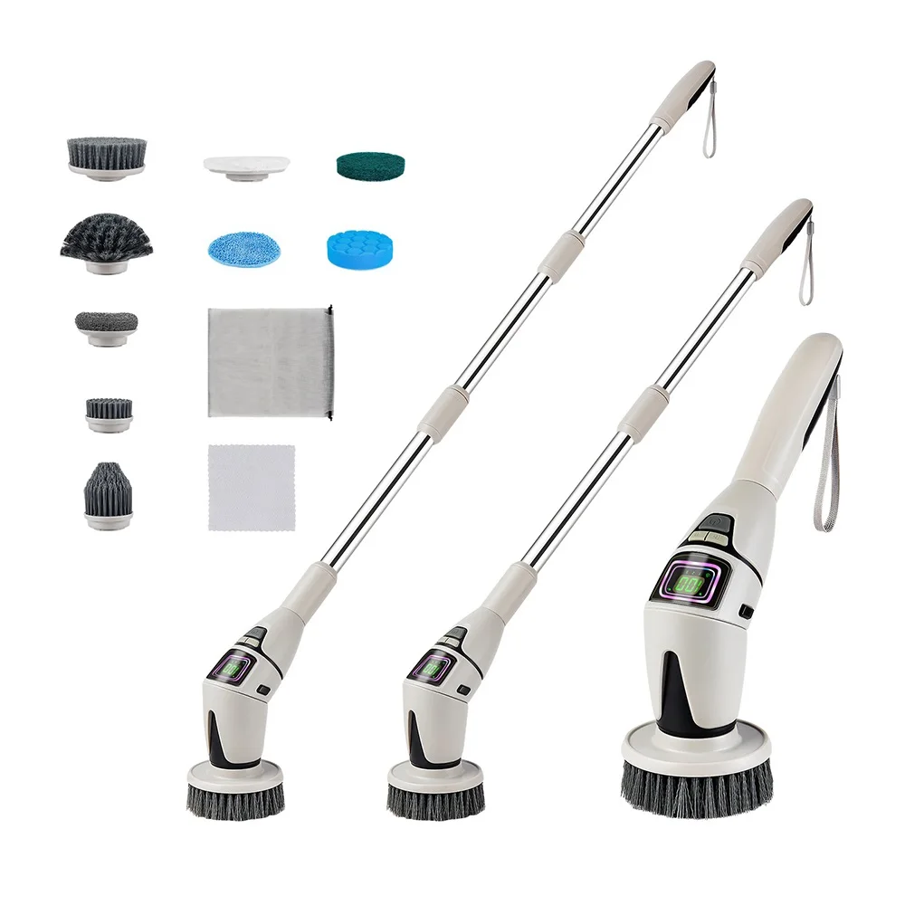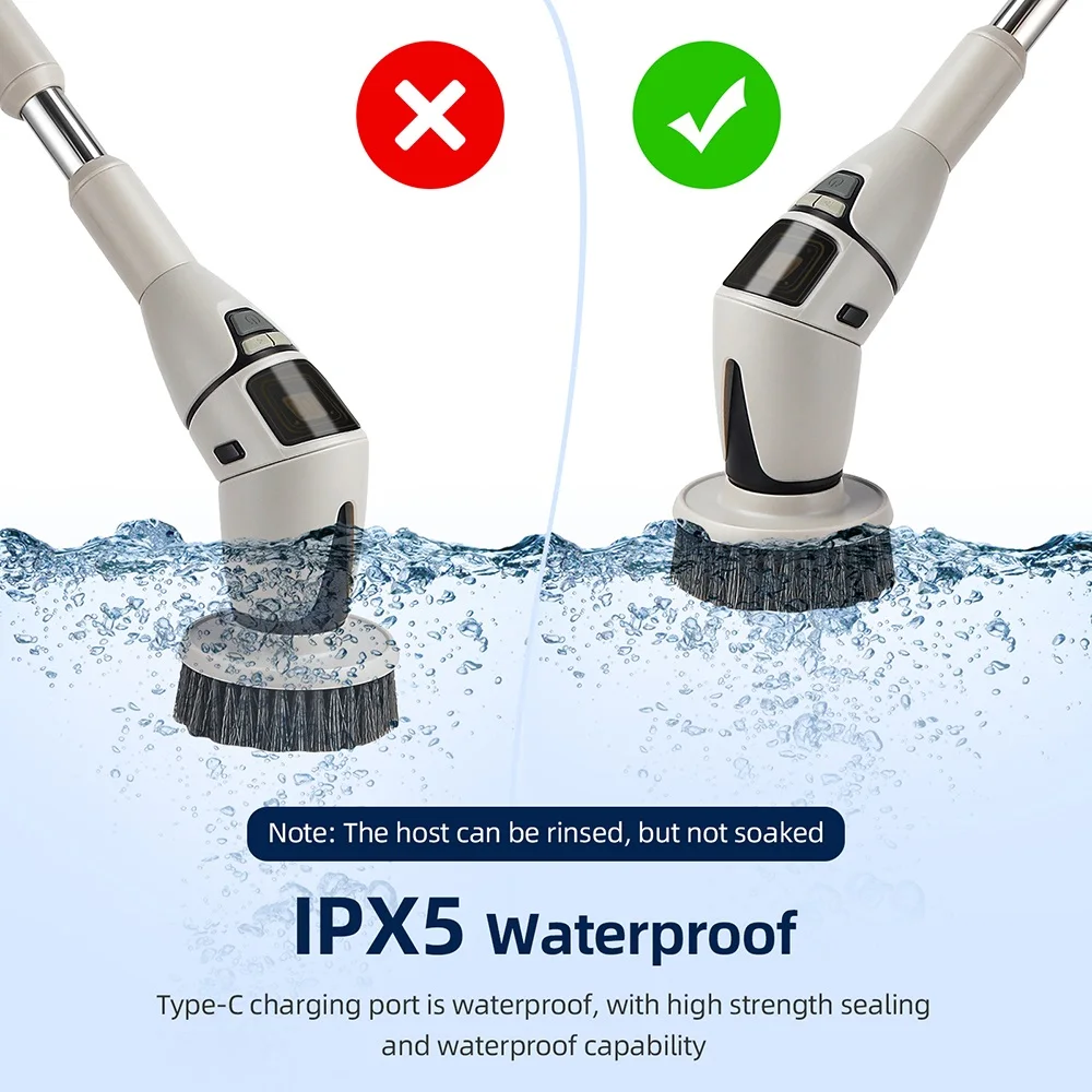 6. Extendable rod. The electric cleaning brush is equipped with a detachable and retractable metal extension rod, allowing easy access to tight corners and high spots, making cleaning under furniture, around faucets, and in ceiling corners a breeze.