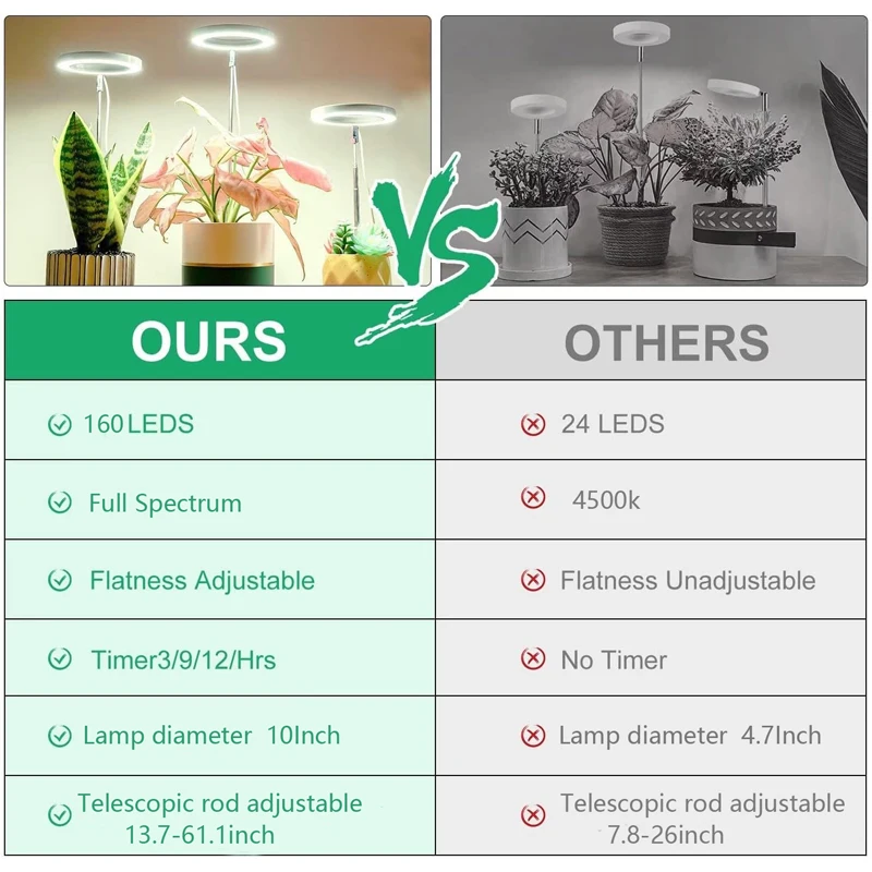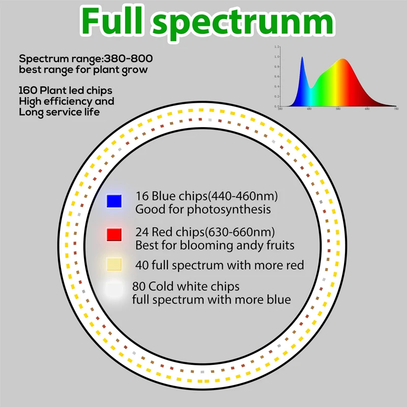 1.10″ Ring grow light designed for large plant, Full spectrum 380nm-800nm, 160 Leds ( 5000K/80 LEDS, warm white 3000K/40 LEDS, red/24 LEDS, blue/16 LEDS), Stronger lighting effects for more effective plant growth.