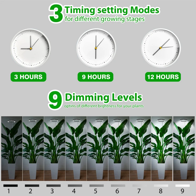 9-Level Dimming: With 9 brightness settings ranging from 10% to 100%, you can adjust the brightness to the level that’s most suitable for your plants.