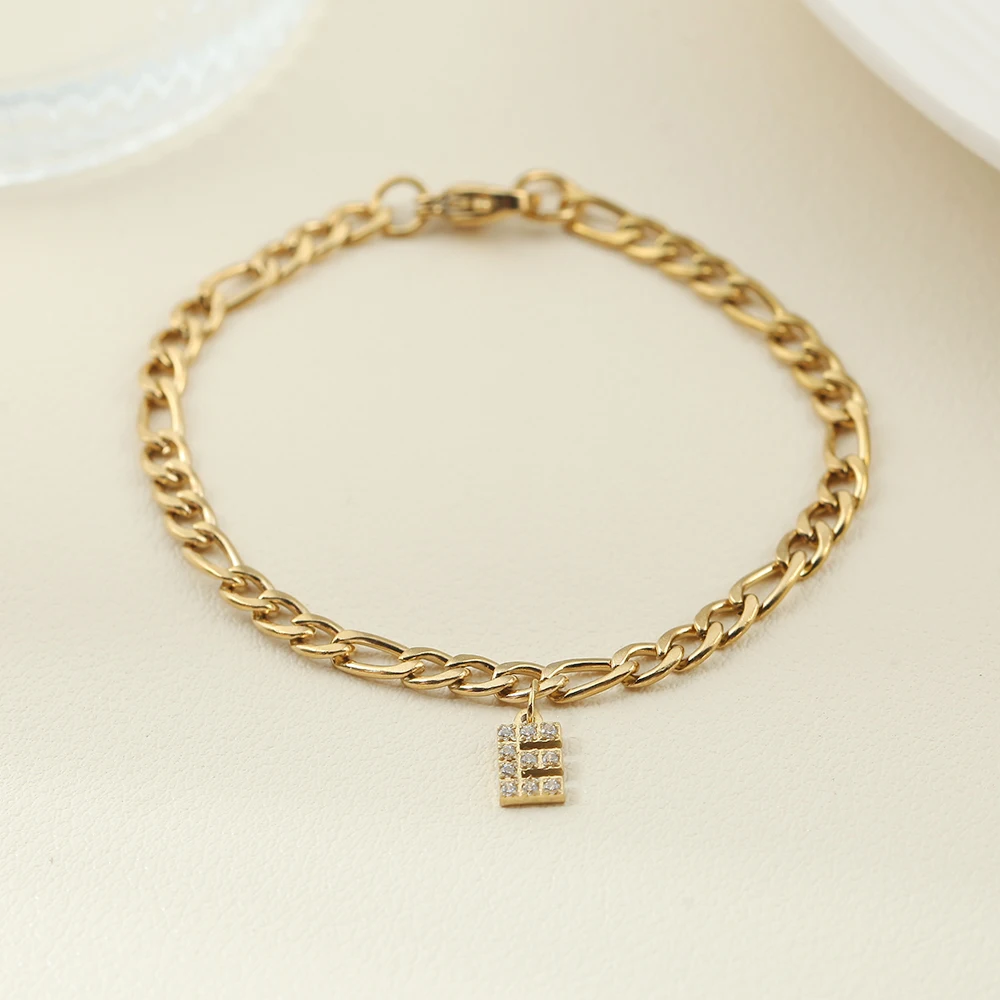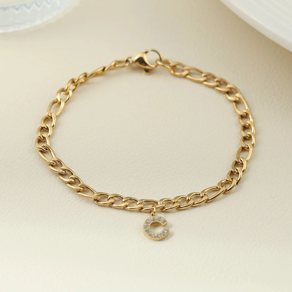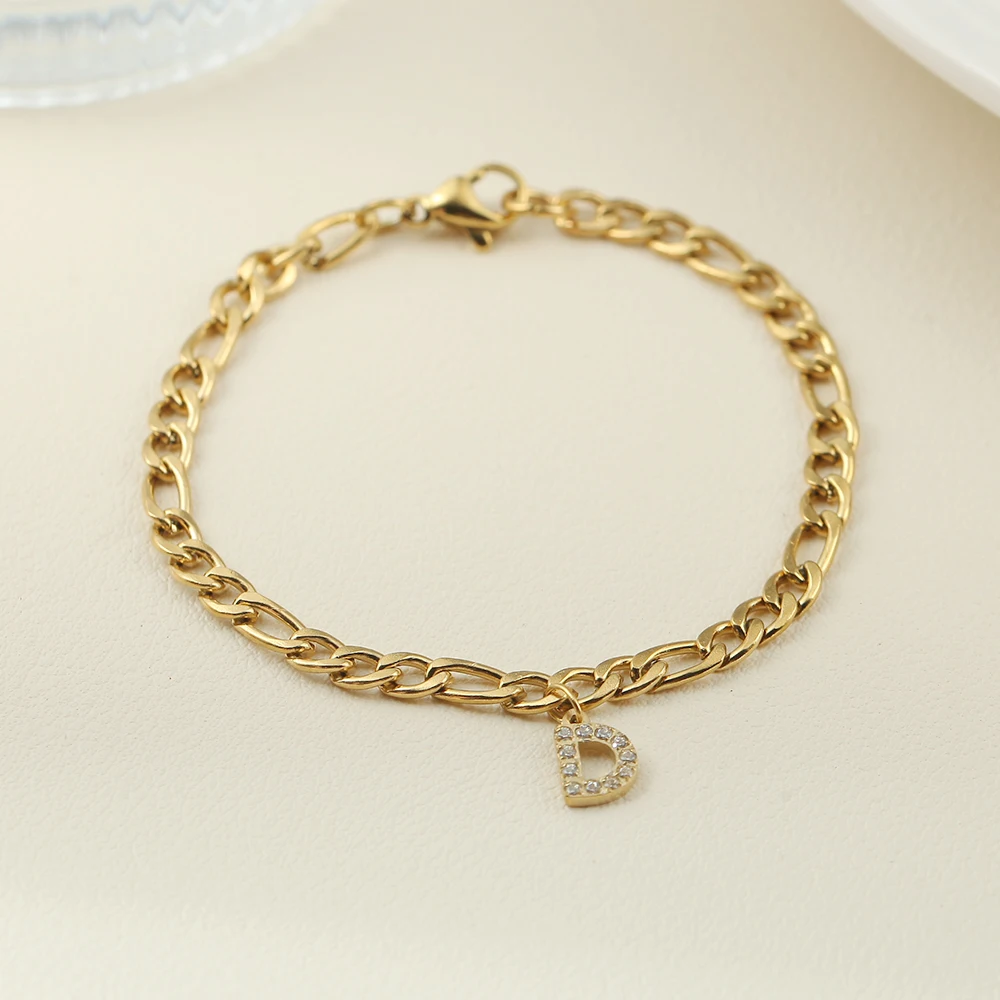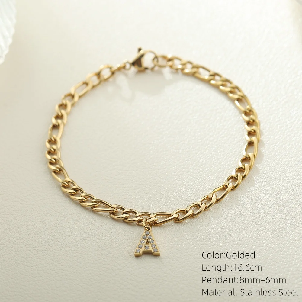 10PCS Simple Style Golded Stainless Steel Women’s Name Bracelet 26 Zircon Letter Pendant Figaro Necklace Jewelry Gift Wholesale