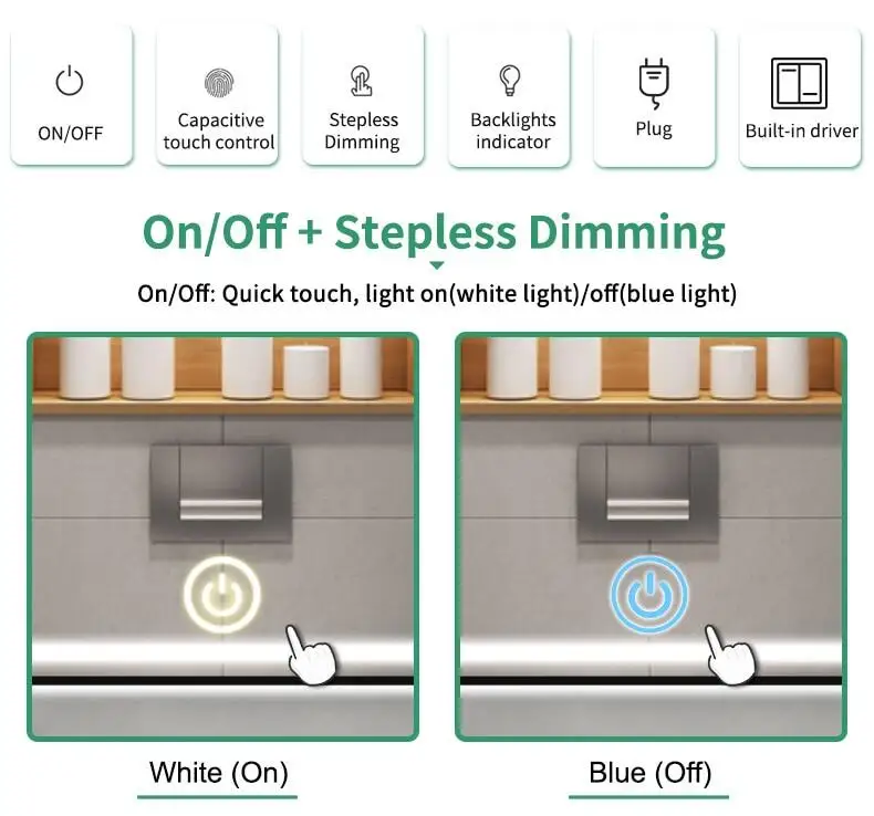 This switch is an isolated touch sensor switch,it is suitable for the led which has protection Cover such as glass, plastic, pottery.