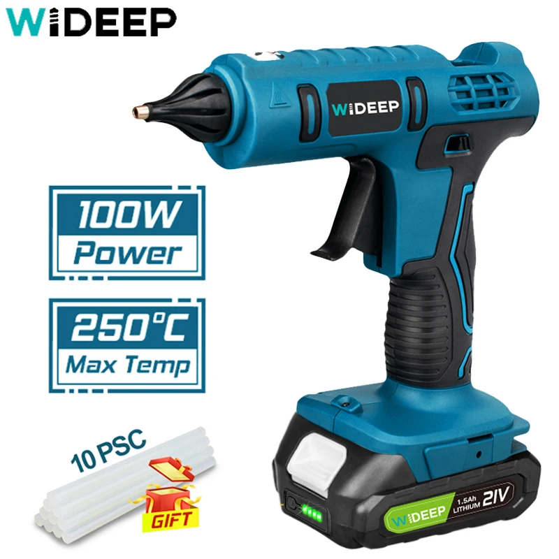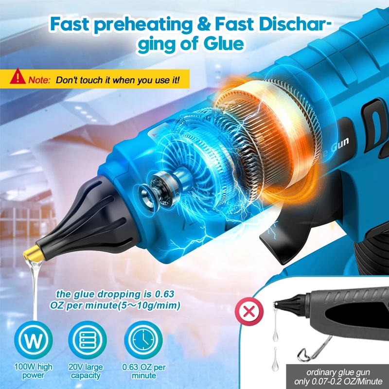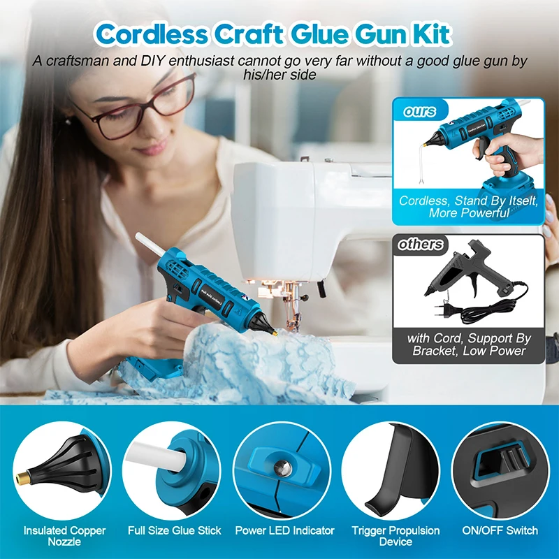 【HEAVY DUTY & COMPATIBILITY】Full size cordless hot glue gun with superior 100W power is a smart choice not only for DIY, crafts, and home repairs but also heavy-duty construction or woodworking projects. Compatible with Makita 18V Lithium-Ion Battery.