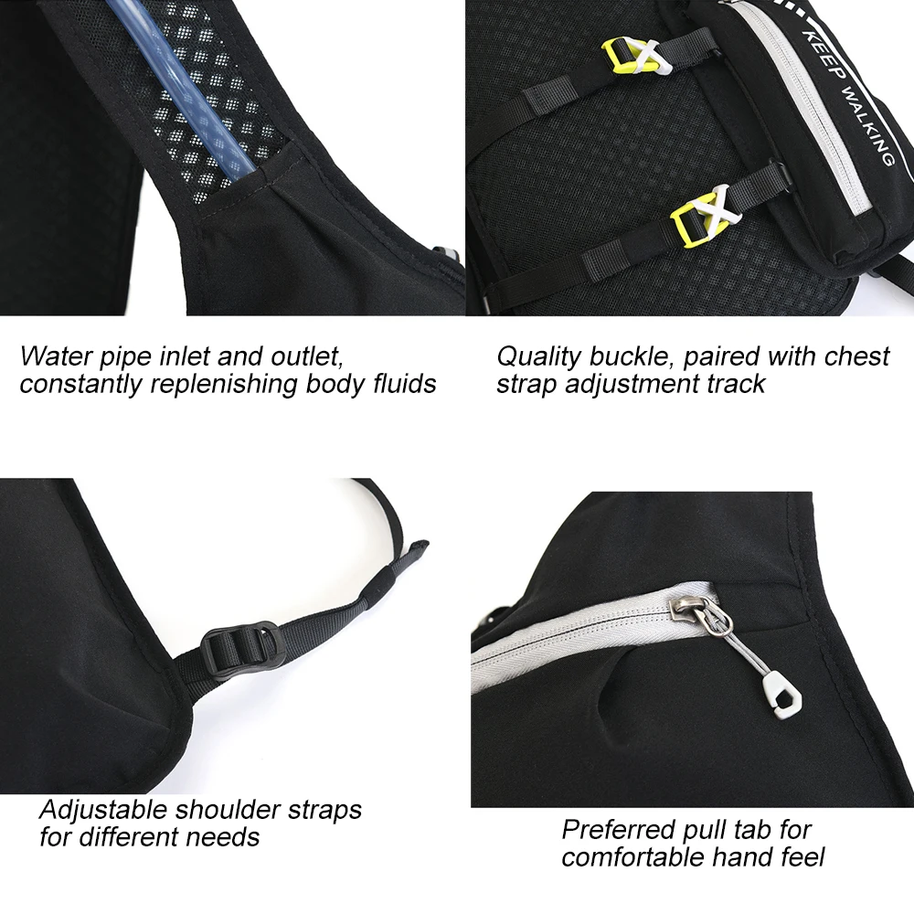 【Large Capacity】The sports hydration pack have several divisions to equip you with everything you need when exercising. On the front, it has 2 multifunctional pockets to store your mobile phone, flasks, key, energy supply items and wet wipes etc. At the same time, it has 1 compartment on the back, which store disposable raincoats, towels, water bladder and others.