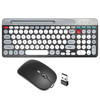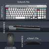 Feature: 1. Retro Punk-style Round Keycaps: This keyboard features a unique retro punk-style design with round keycaps, providing users with a distinctive visual and tactile experience. The high-quality keycaps are durable, comfortable to use, and enhance the overall aesthetics of the keyboard. 2. Dual Mode Wireless Connection: The keyboard and mouse combo supports dual mode wireless connection, allowing users to connect to devices via BT or a 2.4GHz wireless receiver. This enables compatibility with various devices such as computers, tablets, and smartphones, providing a flexible and convenient user experience. 3. Rechargeable Function: The wireless keyboard mouse have rechargeable capabilities, eliminating the hassle of frequent battery replacements. They can be easily charged via USB, offering long-lasting usage time and enhancing work efficiency and convenience. 4. Powerful Office Functionality: The keyboard features a full-size layout with directional keys and a numeric keypad, allowing users to perform quick and accurate input in office scenarios. The mouse utilizes a precise optical sensor, providing a smooth and precise operating experience. 5. Sleek and Durable Design: The BT keyboard and mouse showcases a sleek and durable design. The casing is made from high-quality materials, ensuring durability and abrasion resistance. Additionally, both the keyboard and mouse have a long key lifespan, ensuring long-lasting durability.