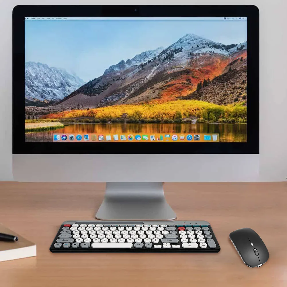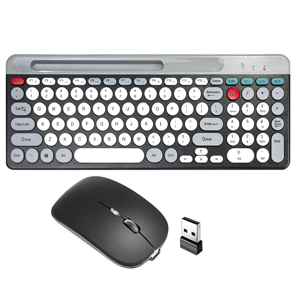 Feature: 1. Retro Punk-style Round Keycaps: This keyboard features a unique retro punk-style design with round keycaps, providing users with a distinctive visual and tactile experience. The high-quality keycaps are durable, comfortable to use, and enhance the overall aesthetics of the keyboard. 2. Dual Mode Wireless Connection: The keyboard and mouse combo supports dual mode wireless connection, allowing users to connect to devices via BT or a 2.4GHz wireless receiver. This enables compatibility with various devices such as computers, tablets, and smartphones, providing a flexible and convenient user experience. 3. Rechargeable Function: The wireless keyboard mouse have rechargeable capabilities, eliminating the hassle of frequent battery replacements. They can be easily charged via USB, offering long-lasting usage time and enhancing work efficiency and convenience. 4. Powerful Office Functionality: The keyboard features a full-size layout with directional keys and a numeric keypad, allowing users to perform quick and accurate input in office scenarios. The mouse utilizes a precise optical sensor, providing a smooth and precise operating experience. 5. Sleek and Durable Design: The BT keyboard and mouse showcases a sleek and durable design. The casing is made from high-quality materials, ensuring durability and abrasion resistance. Additionally, both the keyboard and mouse have a long key lifespan, ensuring long-lasting durability.