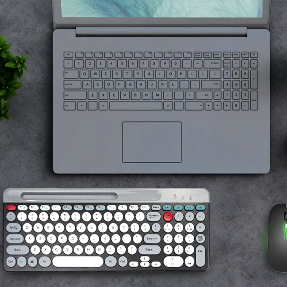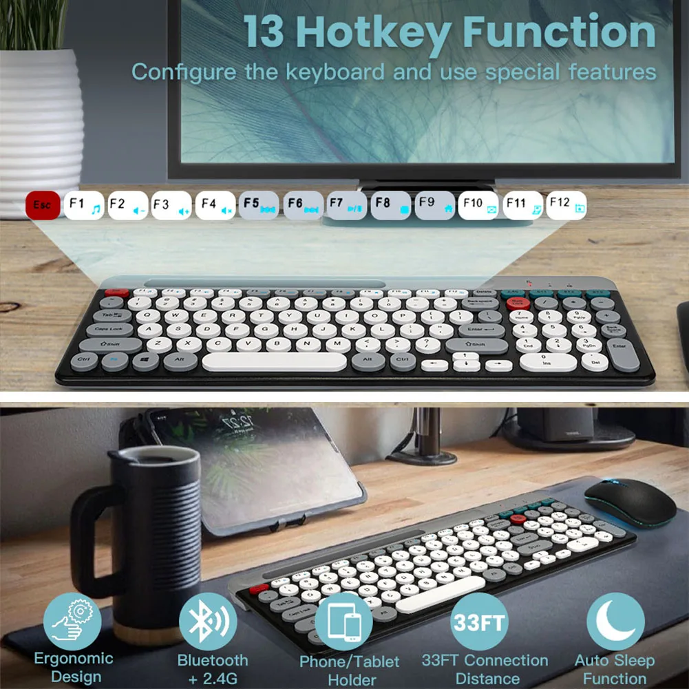 2.4Ghz Bluetooth-compaitble Dual Mode Keyboard and Mouse Combo with Phone Holder Wireless Keyboard Mouse Ergonomic Wireless Multi-Device Keyboard Mouse Rechargeable Compatible for Mac/iOS/Android/Win7 Feature: 1. Retro Punk-style Round Keycaps: This keyboard features a unique retro punk-style design with round keycaps, providing users with a distinctive visual and tactile experience. The high-quality keycaps are durable, comfortable to use, and enhance the overall aesthetics of the keyboard. 2. Dual Mode Wireless Connection: The keyboard and mouse combo supports dual mode wireless connection, allowing users to connect to devices via BT or a 2.4GHz wireless receiver. This enables compatibility with various devices such as computers, tablets, and smartphones, providing a flexible and convenient user experience. 3. Rechargeable Function: The wireless keyboard mouse have rechargeable capabilities, eliminating the hassle of frequent battery replacements. They can be easily charged via USB, offering long-lasting usage time and enhancing work efficiency and convenience. 4. Powerful Office Functionality: The keyboard features a full-size layout with directional keys and a numeric keypad, allowing users to perform quick and accurate input in office scenarios. The mouse utilizes a precise optical sensor, providing a smooth and precise operating experience. 5. Sleek and Durable Design: The BT keyboard and mouse showcases a sleek and durable design. The casing is made from high-quality materials, ensuring durability and abrasion resistance. Additionally, both the keyboard and mouse have a long key lifespan, ensuring long-lasting durability.