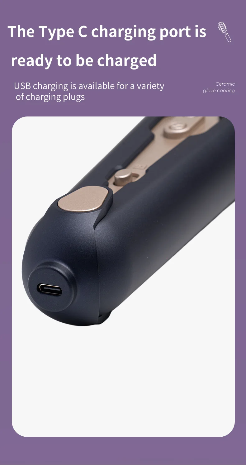 6. Type-C charging port, enabling quick and convenient charging. In addition, our hair styler supports fast charging, shortening the charging time. Say goodbye to the long charging wait and enjoy an efficient styling experience.