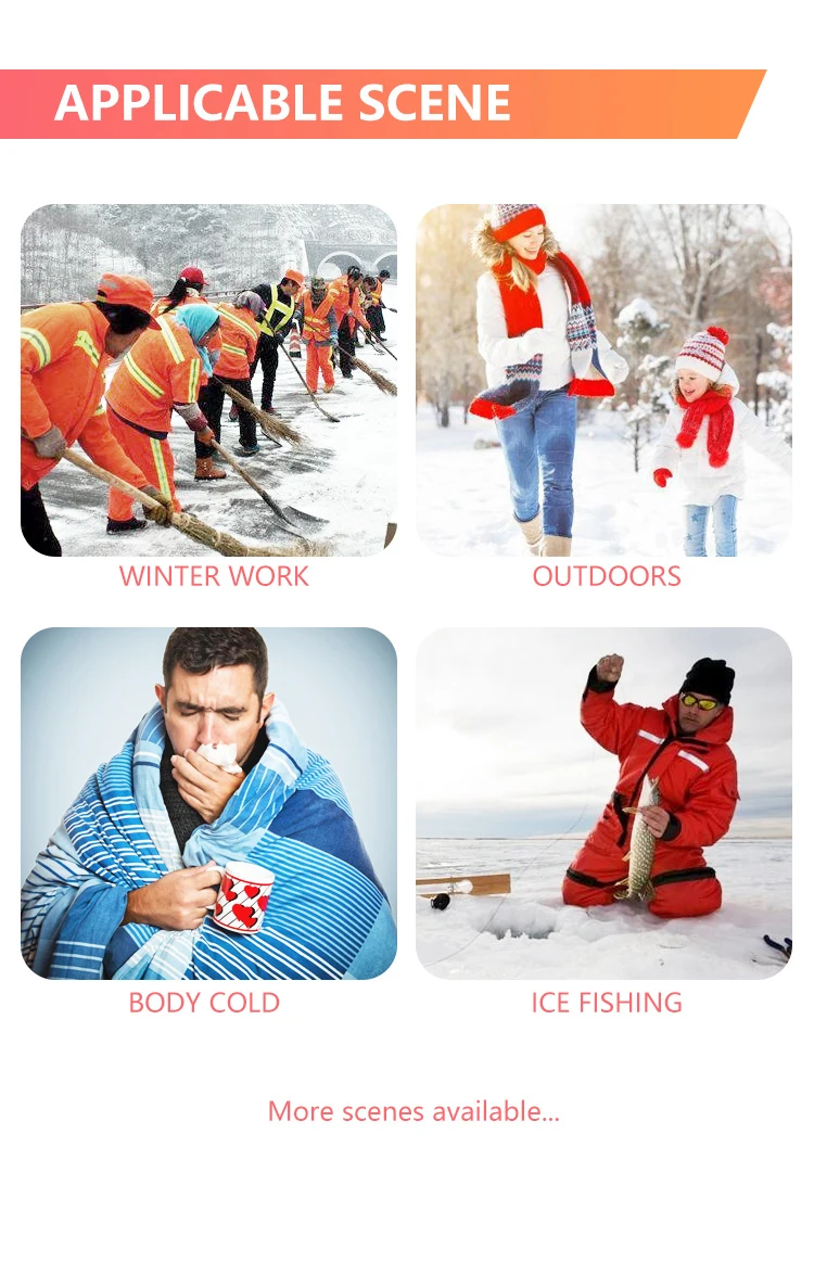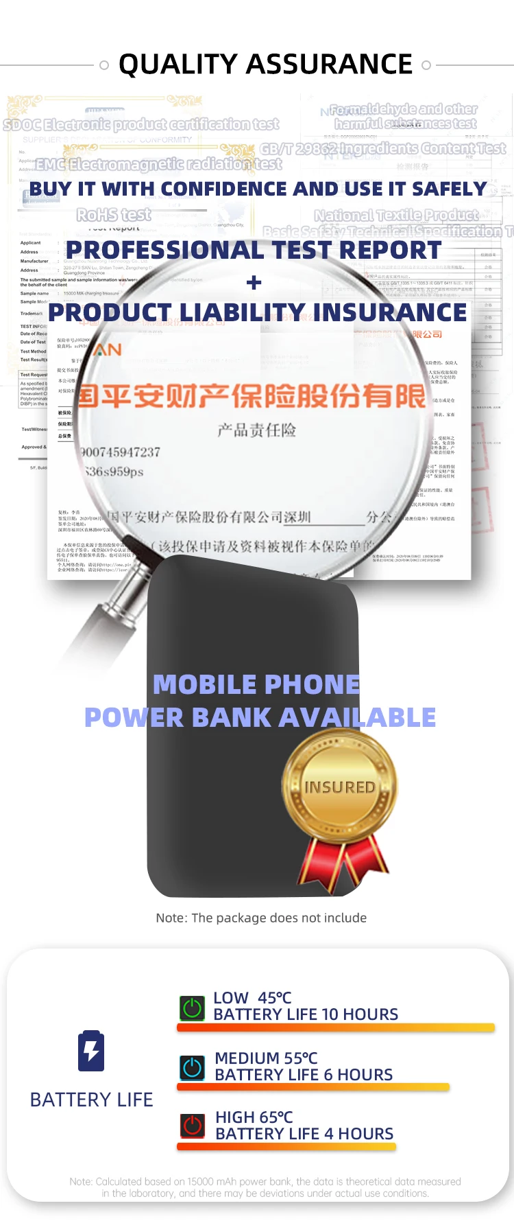 【Universal USB Plug and Safety Heating】The heating body warmer has convenient USB plug which fits for most 5V/2A power bank (The power bank is not included); Please make sure to use the 5V / 2A USB port; Don’t handle the power cord of the charger roughly.Never disassemble, repair or modify the product unless you are a repair engineer.