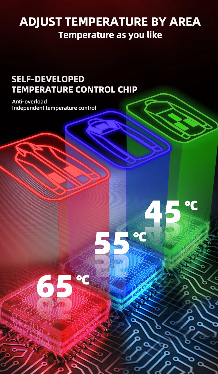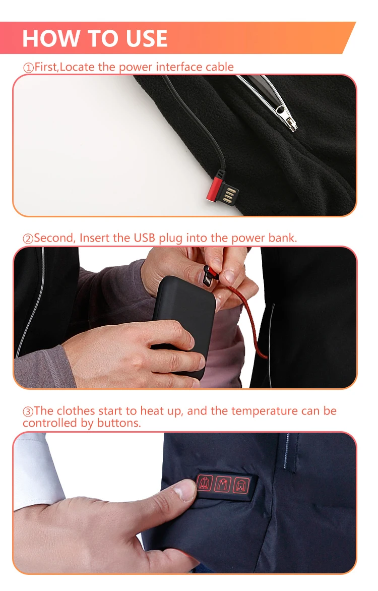 【3-level Temperature Control】One button controls three temperature gears; Red is highest, 55℃- 65℃( 122℉-140℉); Blue is medium, 45℃- 55℃( 113℉-131℉); Green is lowest, 35.7℃- 40℃(96.3℉-104℉); The USB port connects the power bank, the power supply will start automatically. The green lamp will light up.Long press the button for 3s to turn it off, click it to change the temperature gear; After you turn to the red light, it takes a while to fully heat up