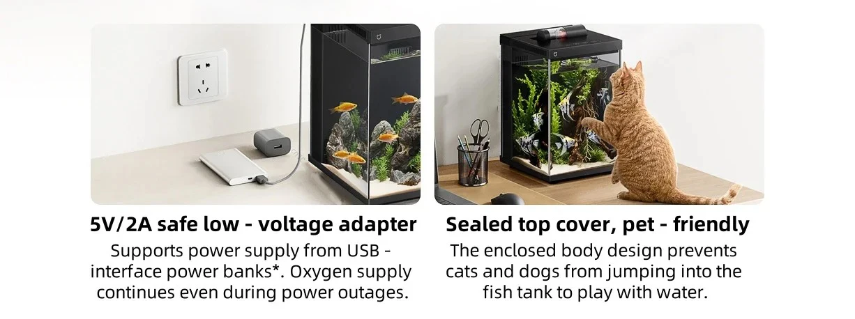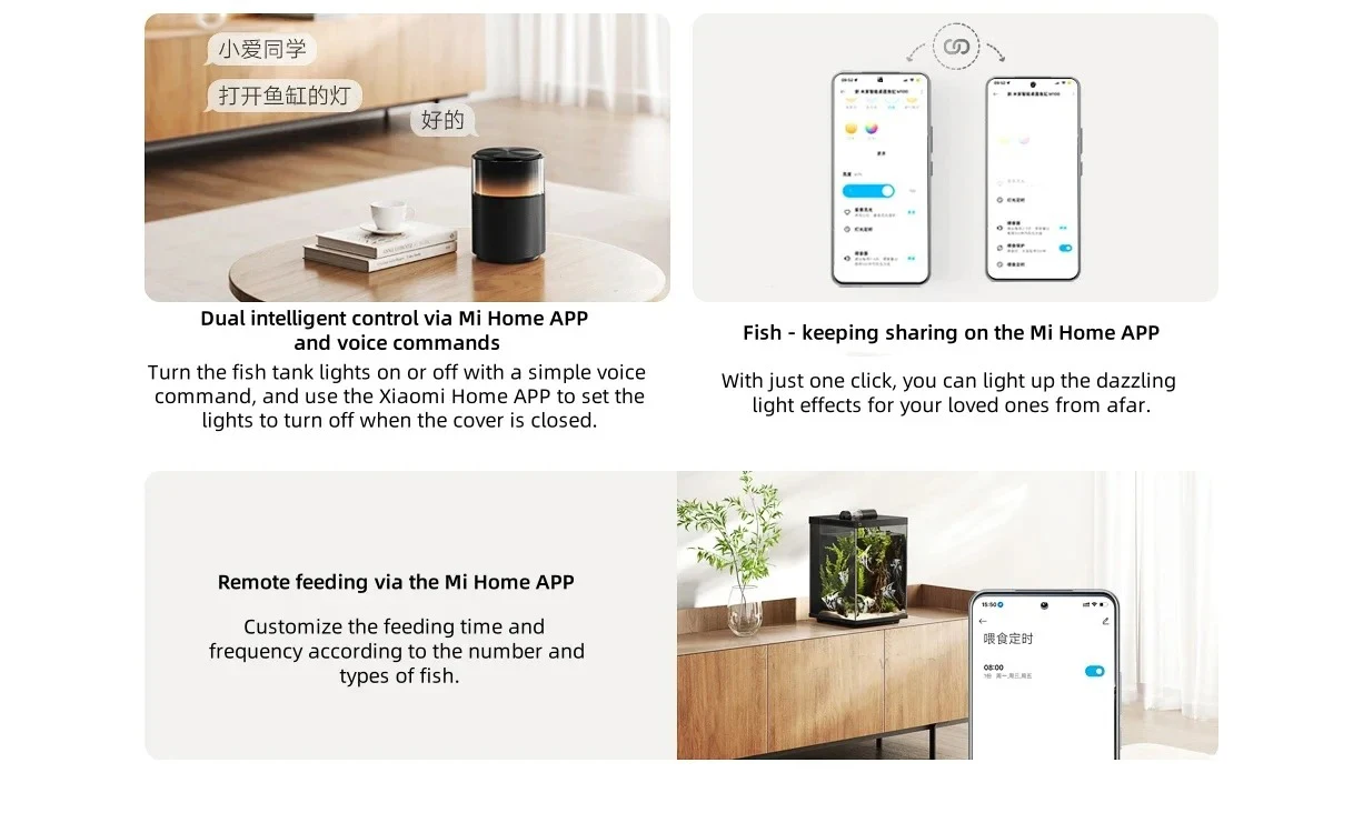 Turn the fish tank lights on or off with a simple voice command, and use the Xiaomi Home APP to set the lights to turn off when the cover is closed.