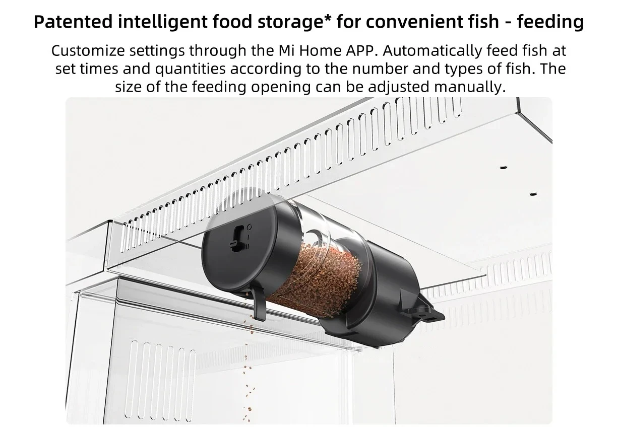 Customize settings through the Xiaomi Home APP. Automatically feed fish at set times and quantities according to the number and types of fish. The size of the feeding opening can be adjusted manually.