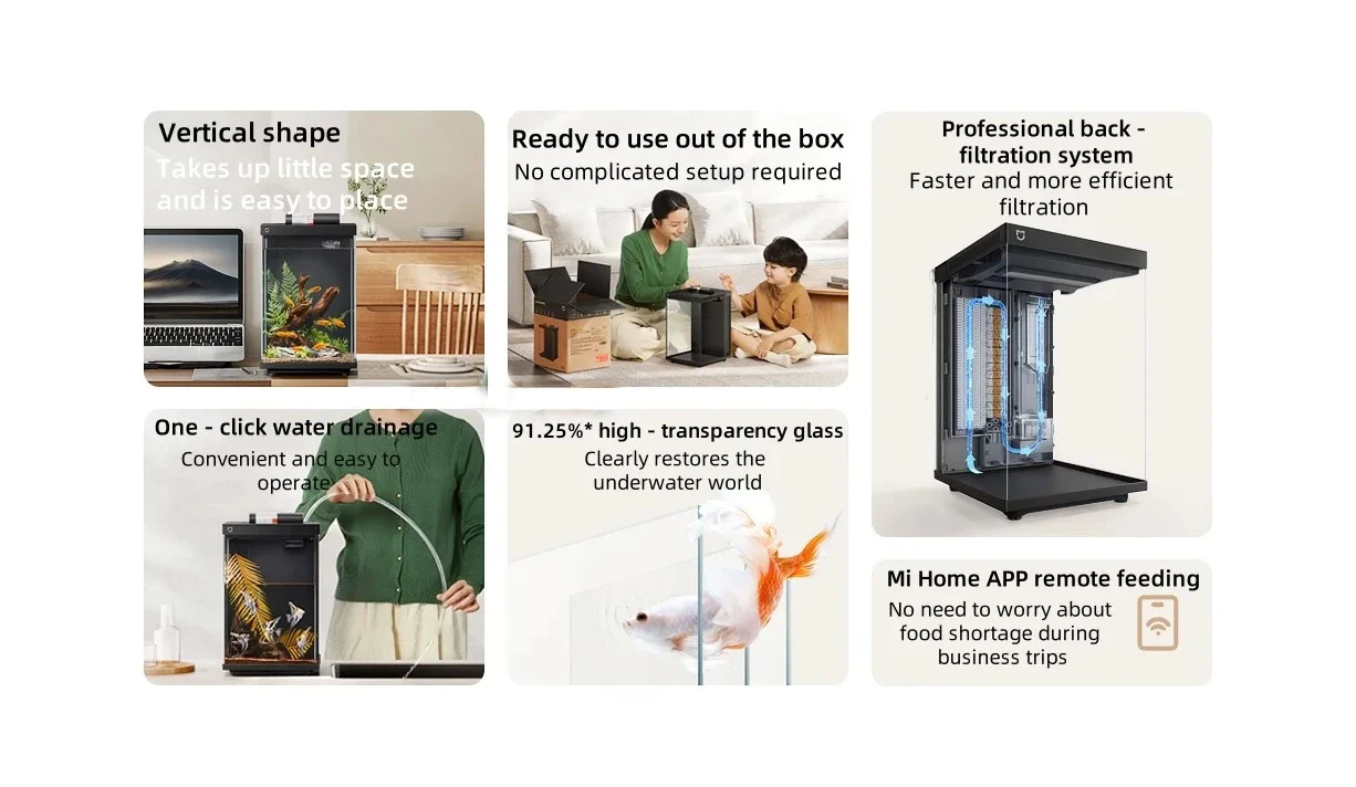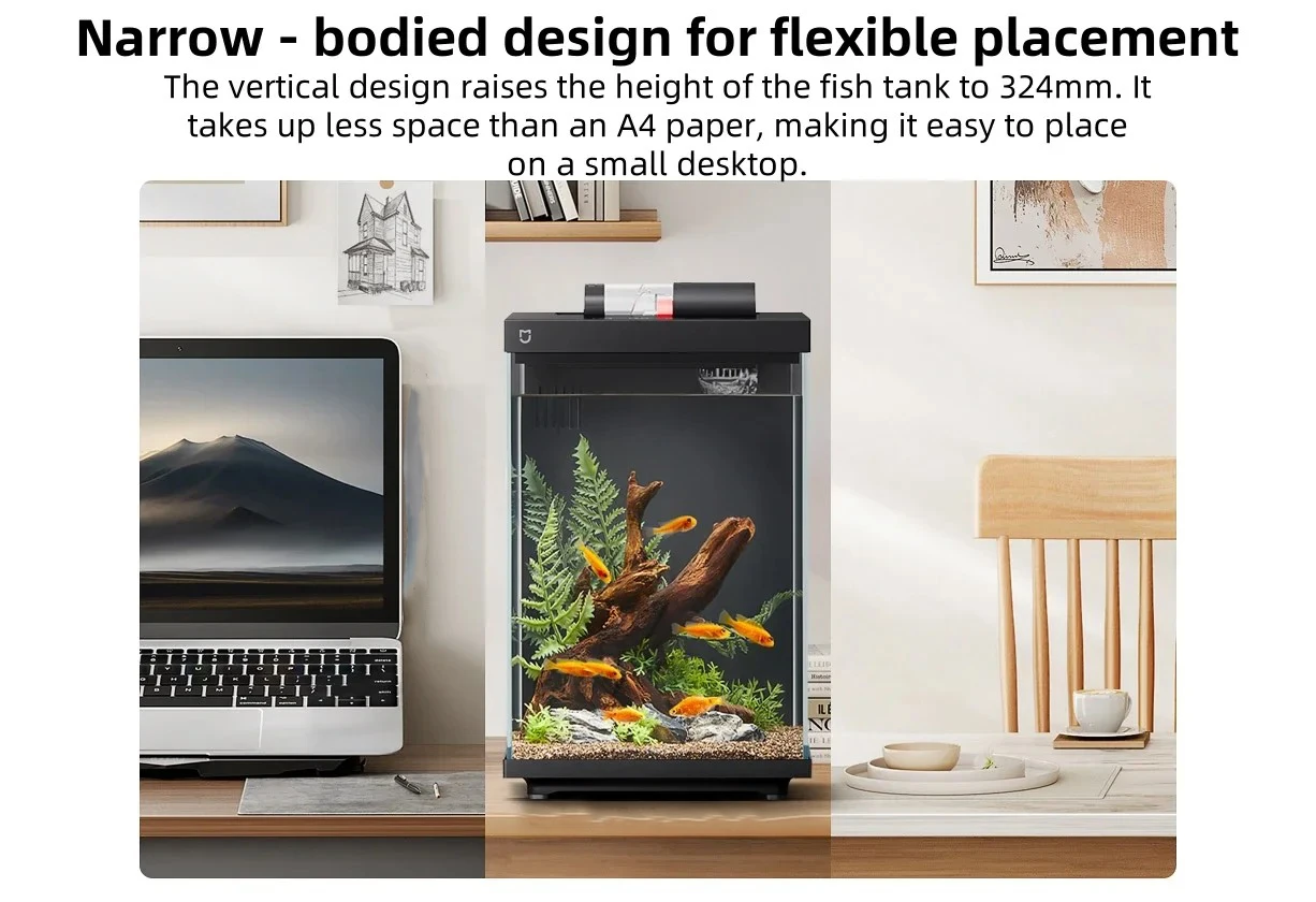 The vertical design raises the height of the fish tank to 324mm. It takes up less space than an A4 paper, making it easy to place on a small desktop.