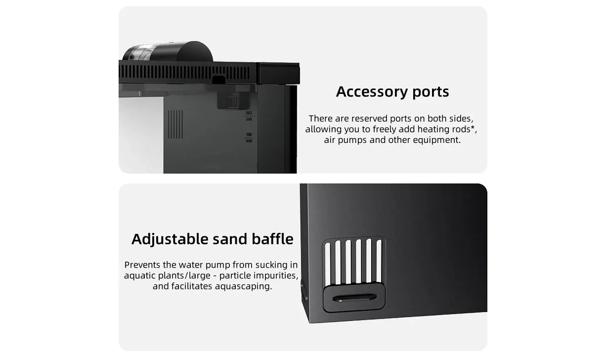 There are reserved ports on both sides, allowing you to freely add heating rods*, air pumps and other equipment.