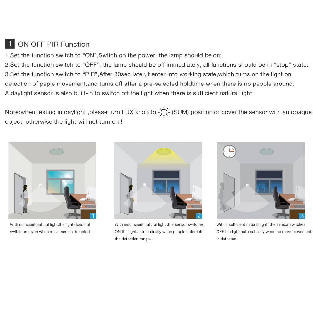 4.Set the function switch to “PIR”, after 30sec later, it enter into working position. The lamp will be turned on after receving the inductor signal.20sec. Under no inductor signal condition, the lamp should be off within 5~10sec.