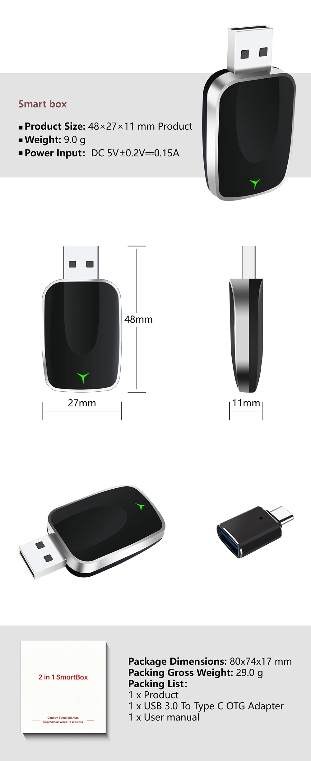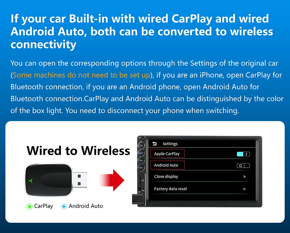 The function of this product is to convert the original wired Carplay/Android Auto into wireless Carplay/Android Auto.