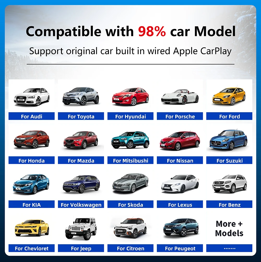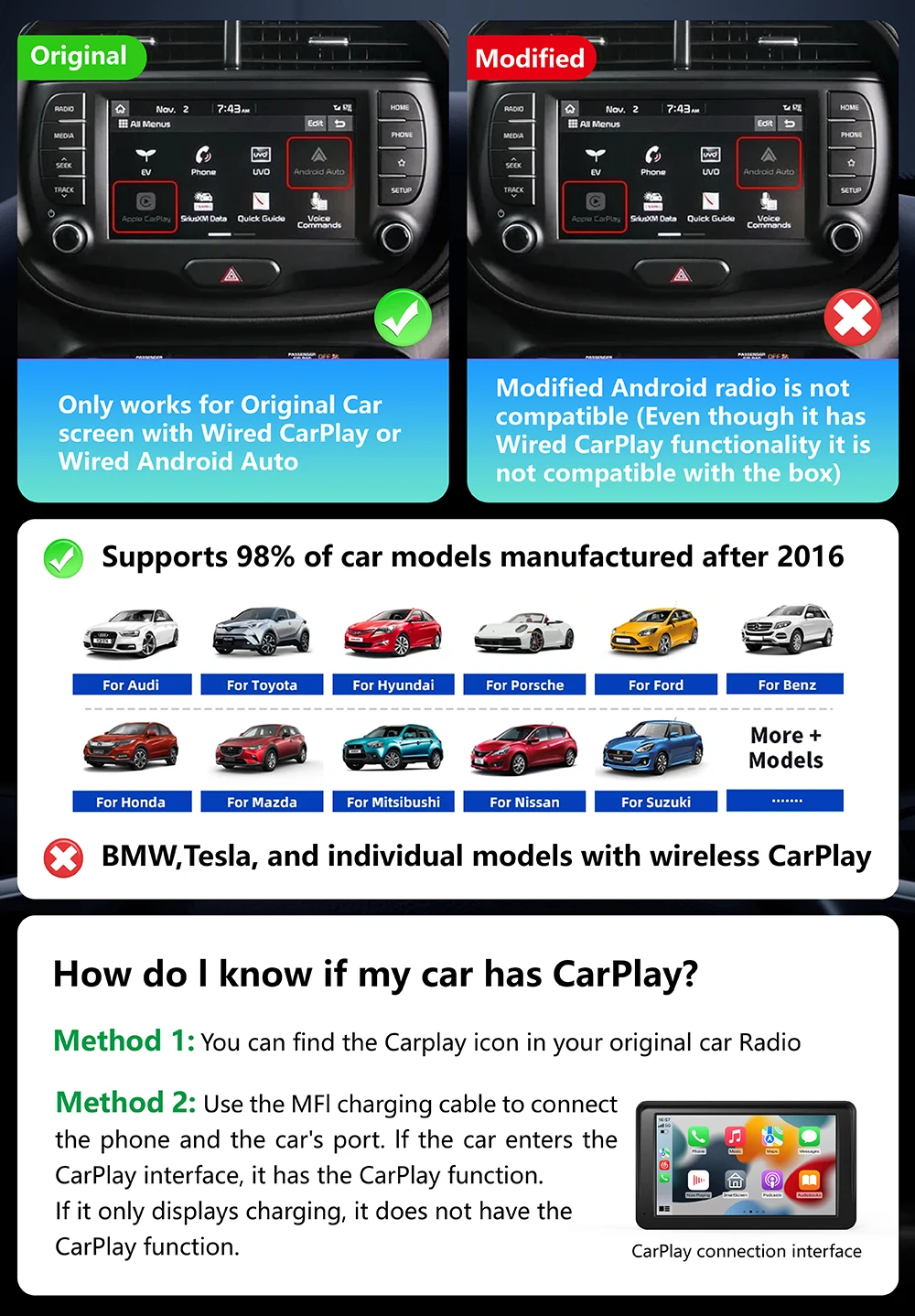 1. Please make sure your original car has OEM CarPlay, This product is suitable for 98% of cars with original wired Carplay. BMW, Tesla and some models are not compatible. If you are not sure. You can contact customer service to inquire.