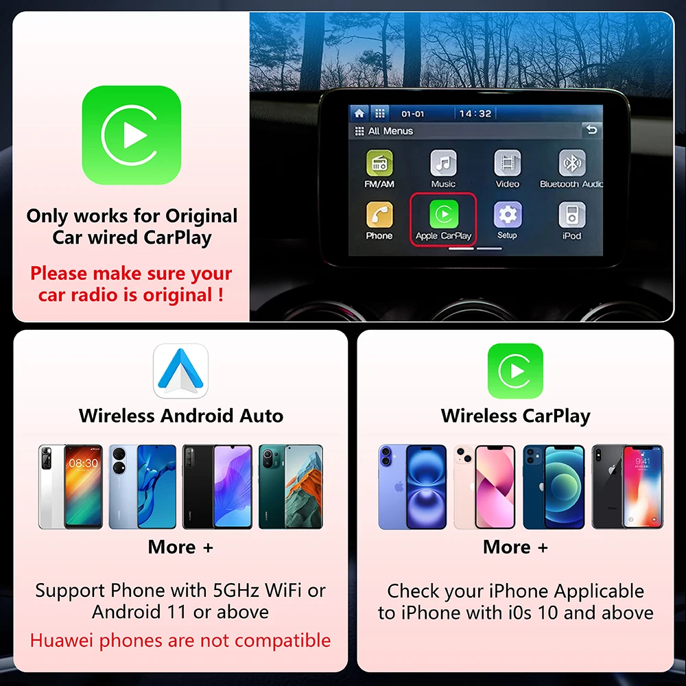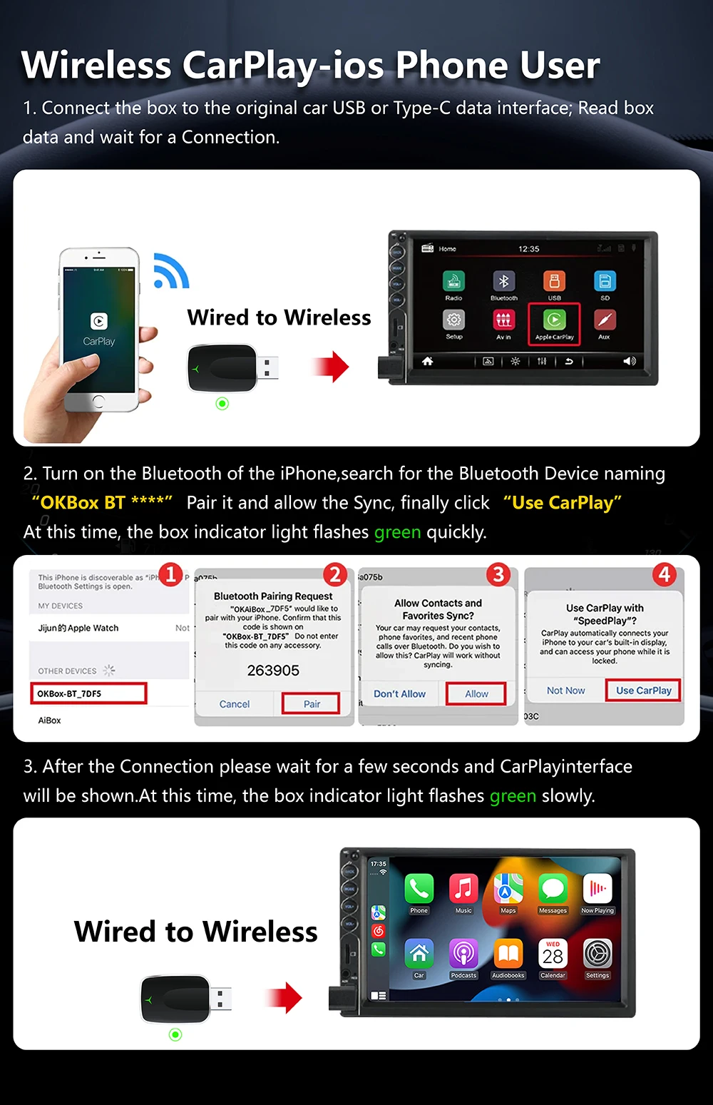 1. Wired to wireless Carplay adapter. USB plug-and-play installation, stable and fast, No need to remove OEM radio.