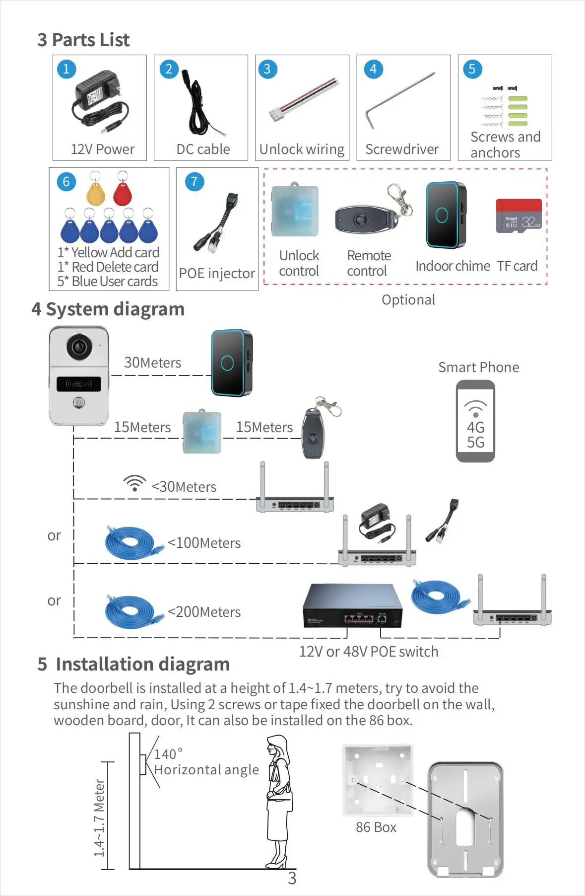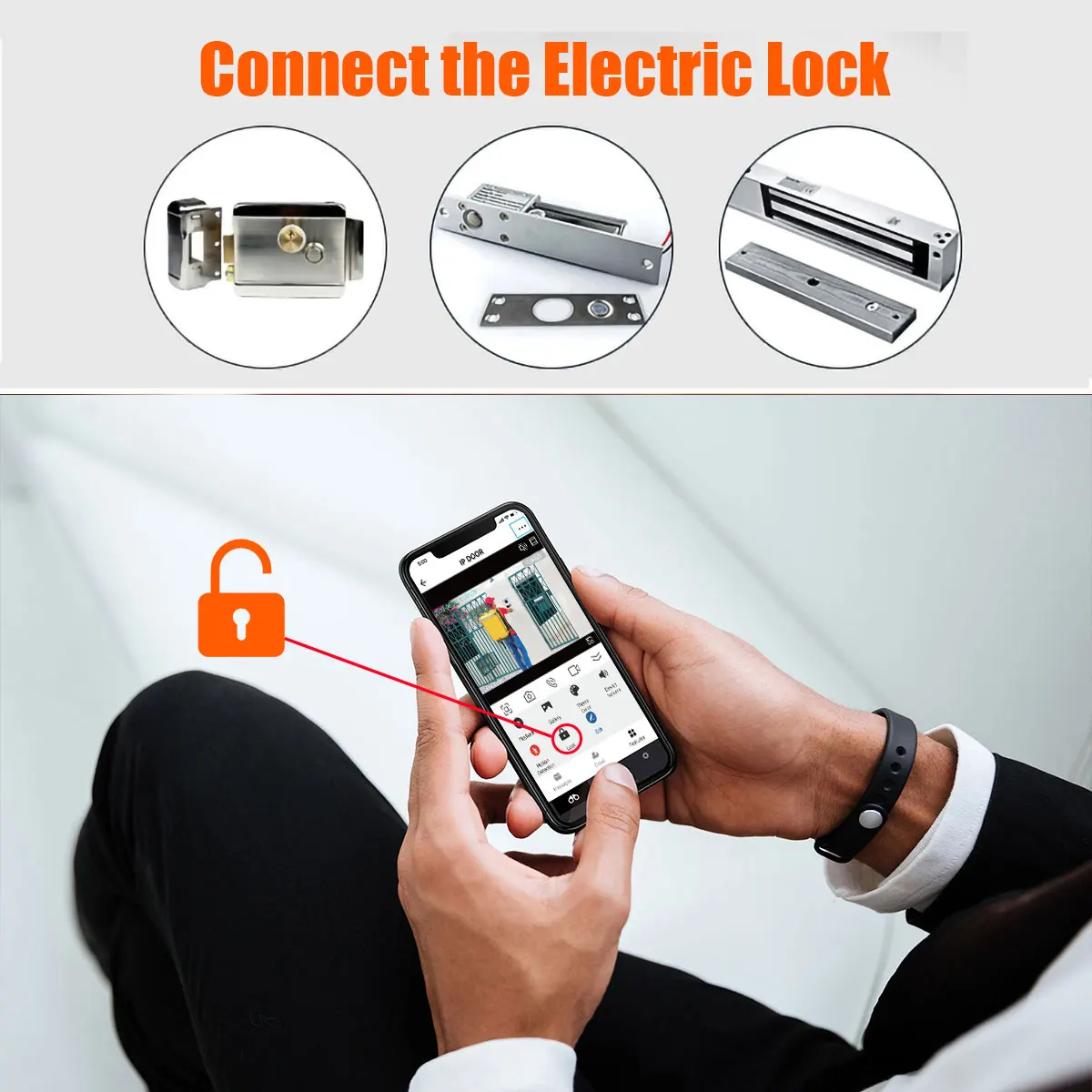 You can use your cell phone to open the door remotely to your friends and family. You can assign ID cards to children or elderly or other family members who don’t use cell phones and let them open the door with their ID cards. Doorbell camera can be connected to either the front door, downstairs or fence gate electric lock.