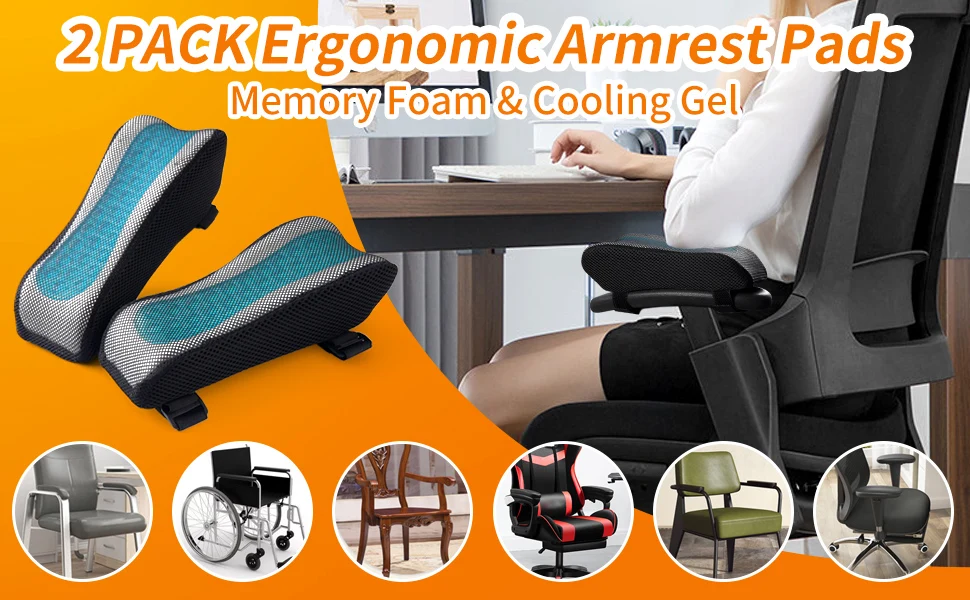 【Premium Memory Foam with Cooling Gel Pad Top】 — The inner core of office chair arm pads is made of 100 percent pure memory foam with moderate hardness which provides a cozy feeling with soft touch. The memory foam cushion includes a cooling gel insert on top to maximize comfort by keeping you cool and absorbing body heat to better adapt to your contours.