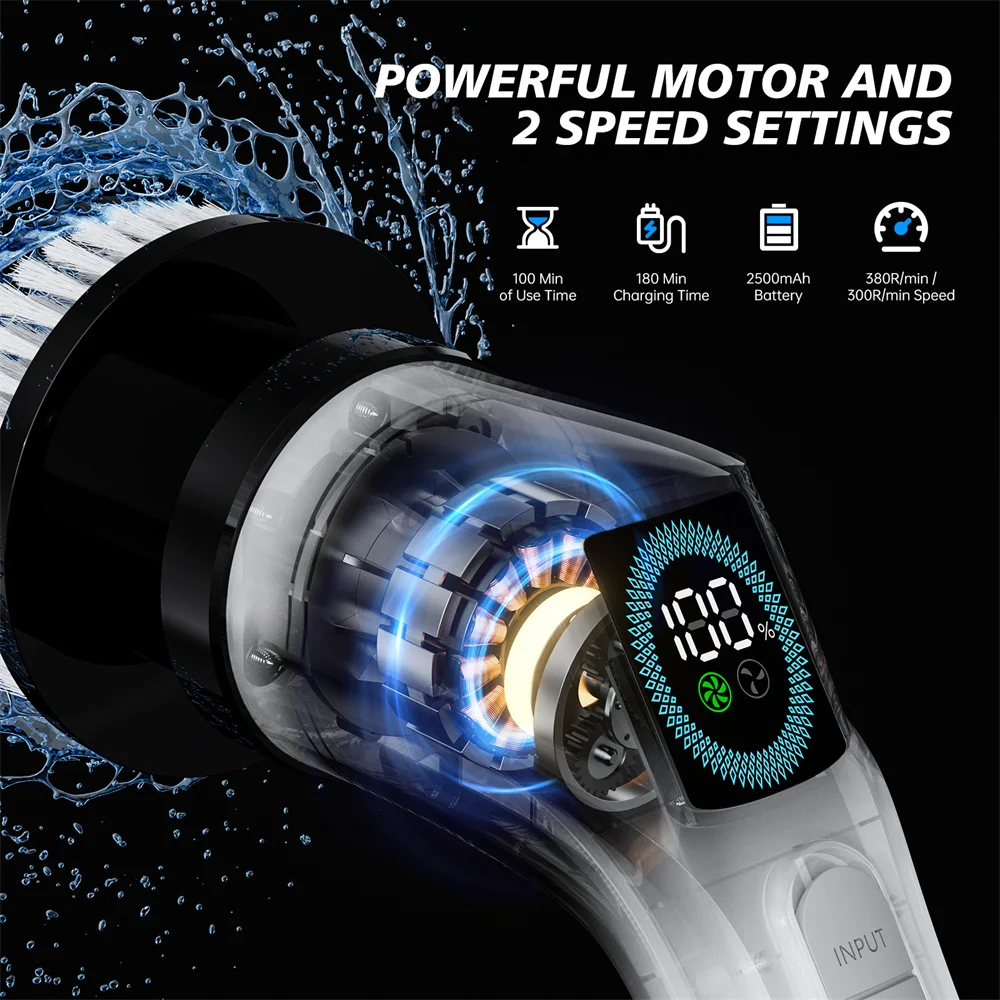 Long-lasting battery life – Powered by a rechargeable 2500 mAh premium Li-ion battery, the shower scrubber can realise a long-lasting working time. 2 hours charge and work efficiently for 90 minutes. It is enough for daily cleaning.