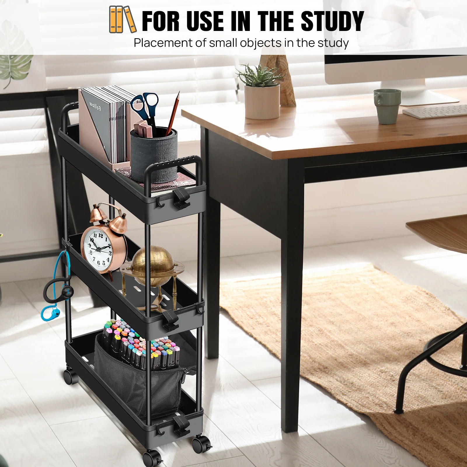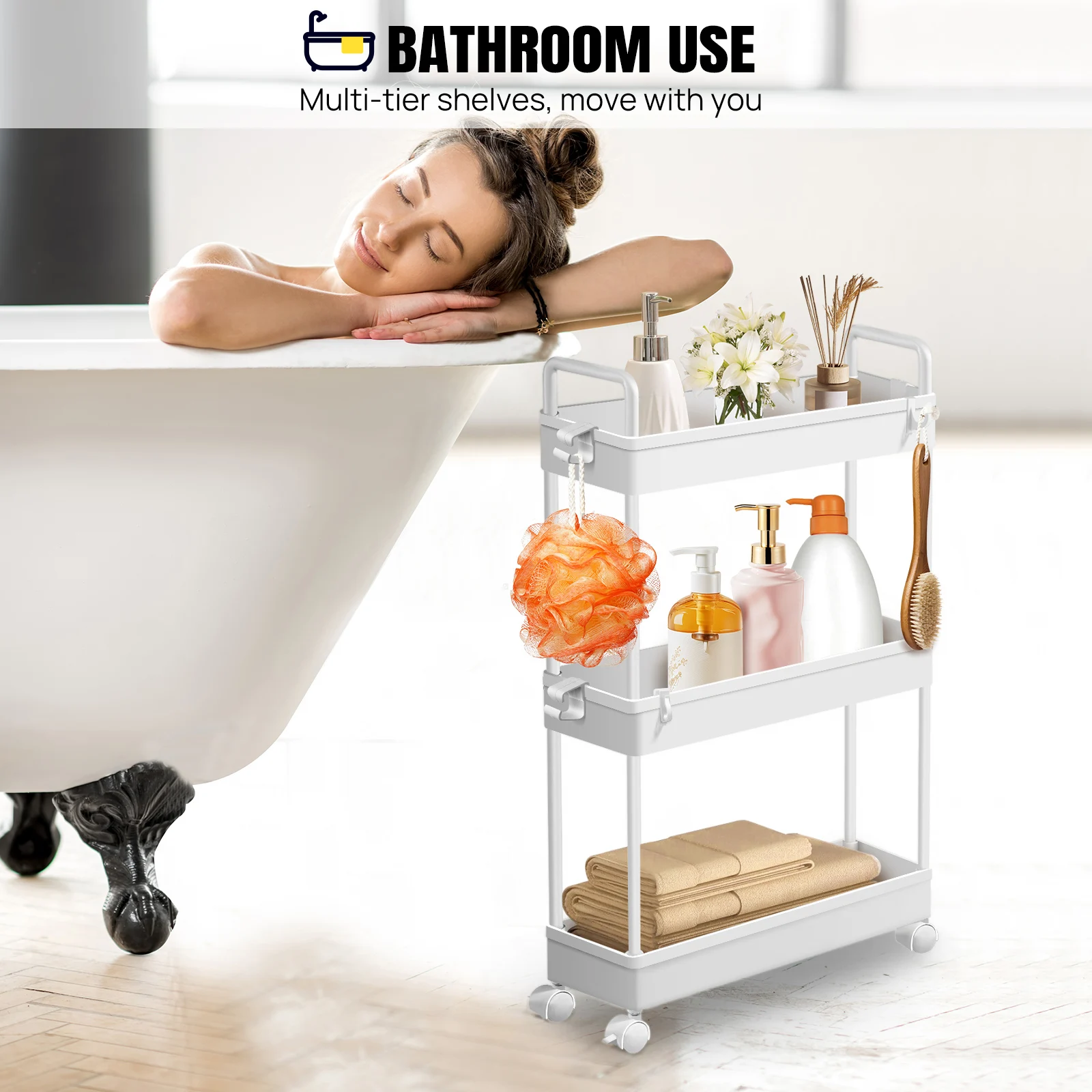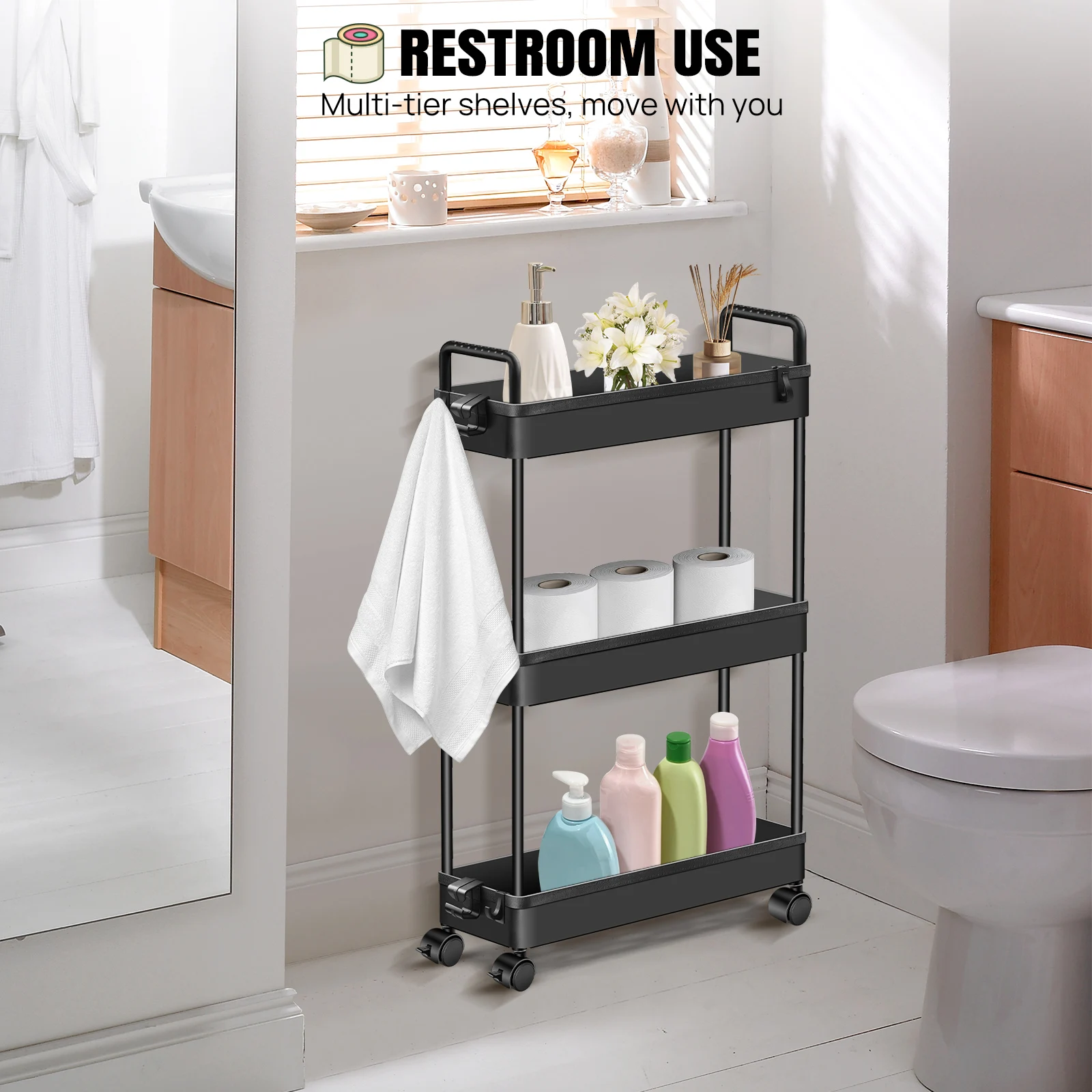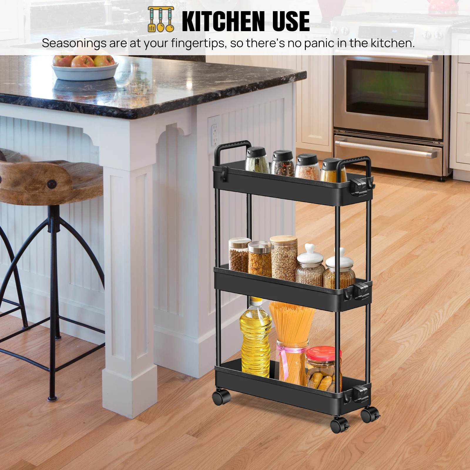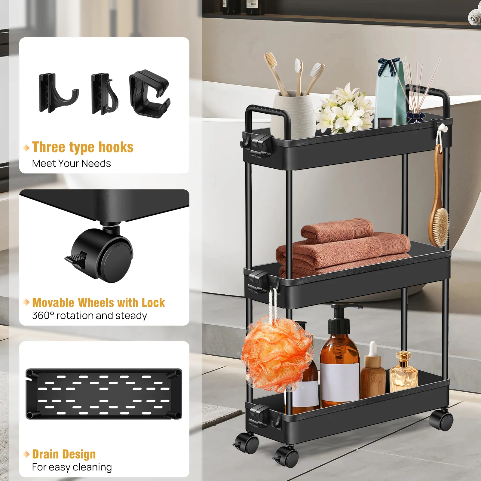 360° Rotating Wheels Mobile Storage Cart, 3-Tier Steel Frame with Hooks for Narrow Spaces Kitchen Bathroom Bedroom