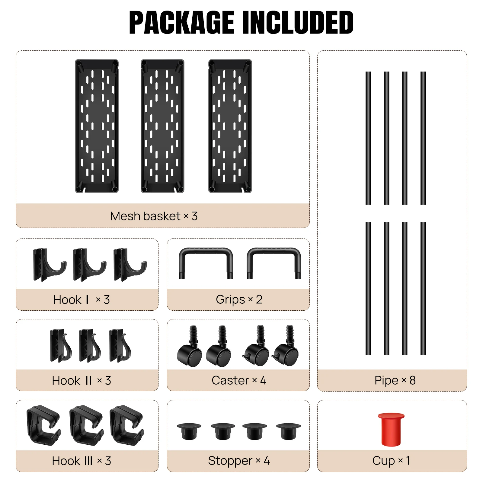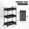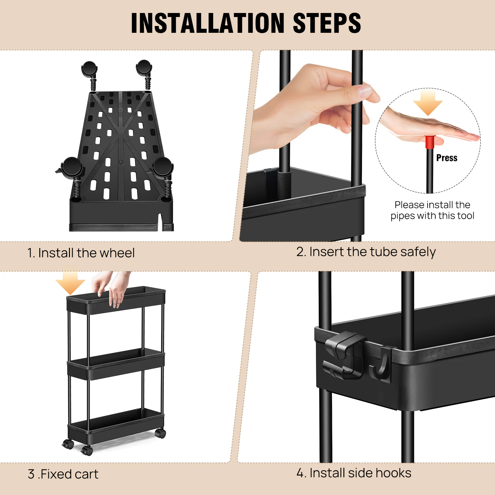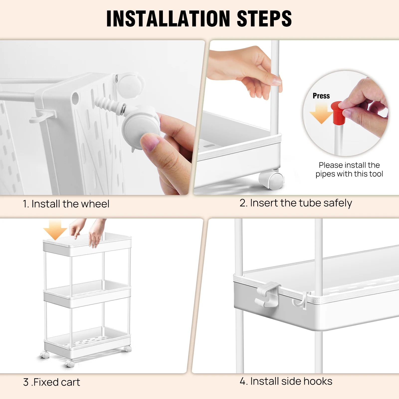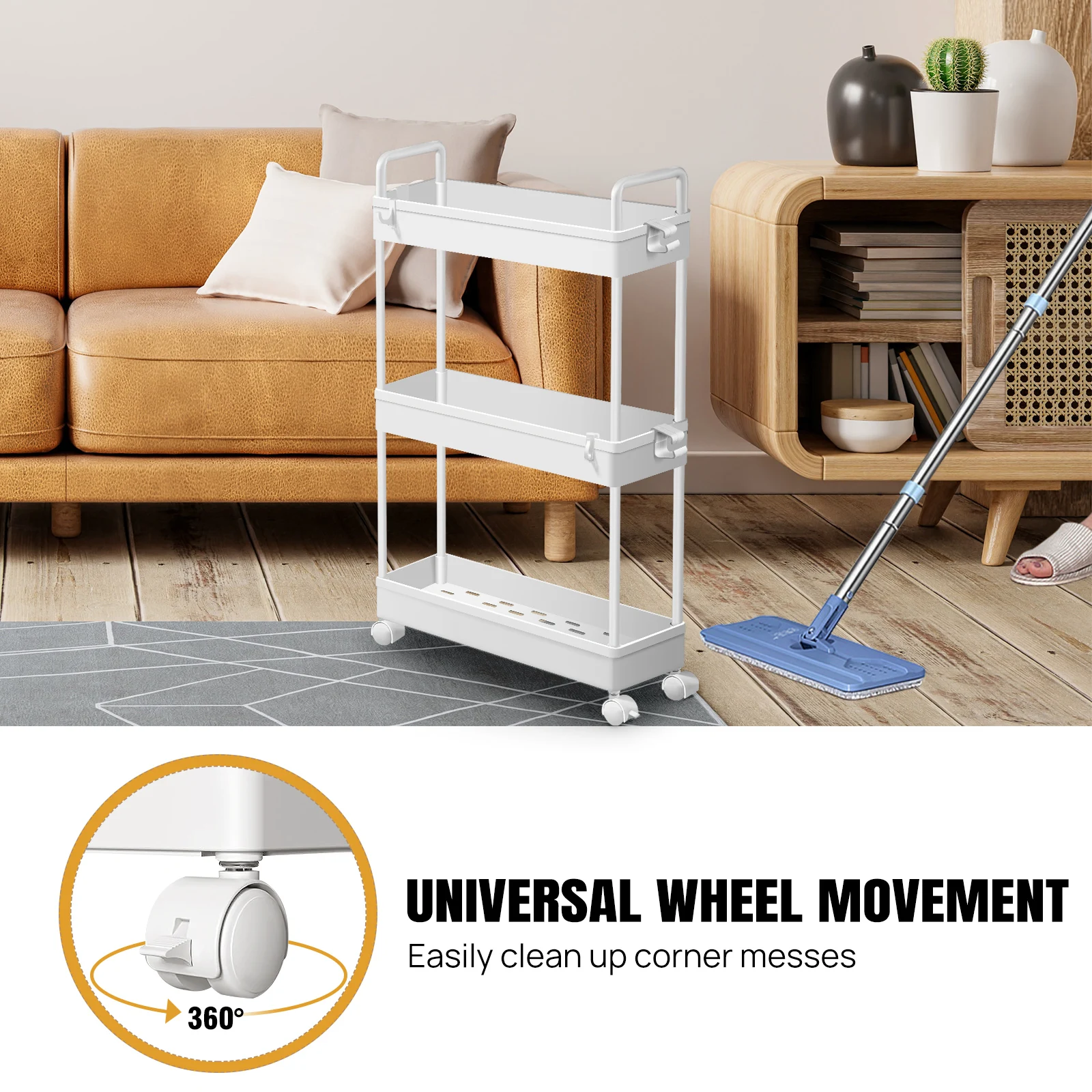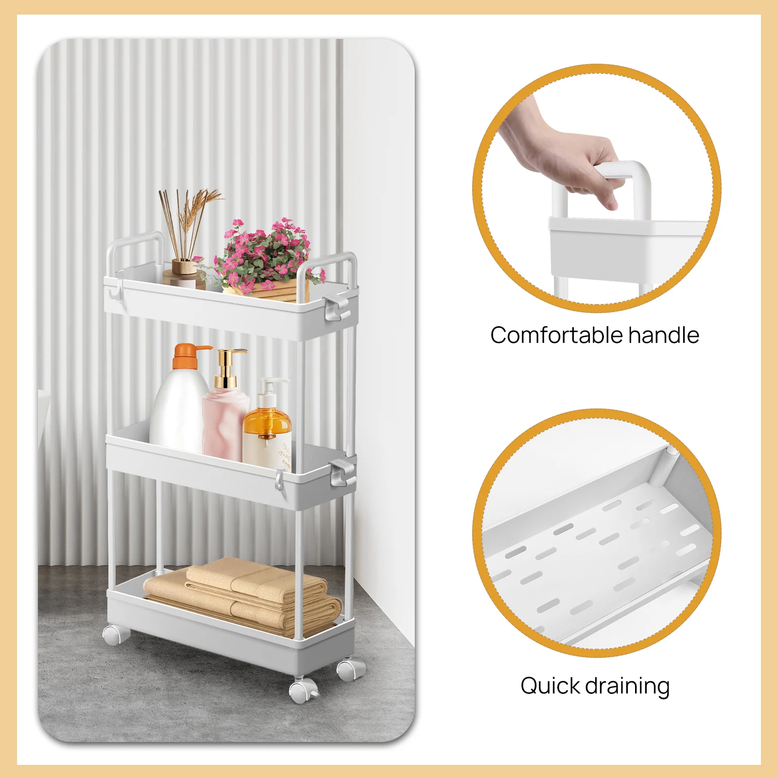 360° Rotating Wheels Mobile Storage Cart, 3-Tier Steel Frame with Hooks for Narrow Spaces Kitchen Bathroom Bedroom