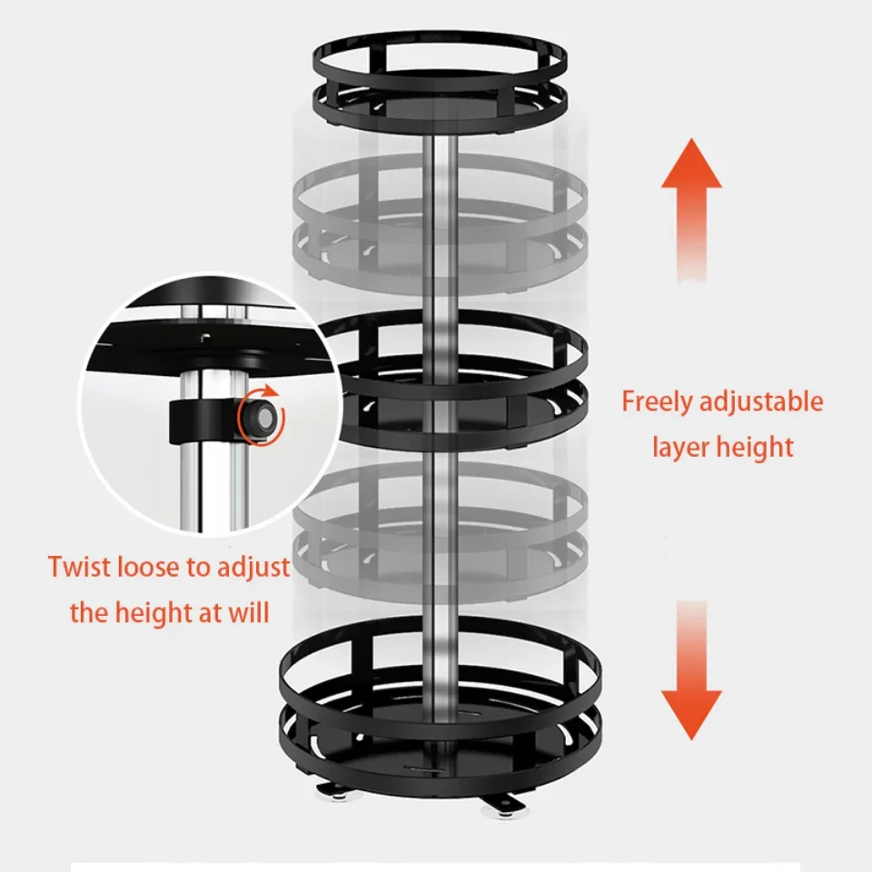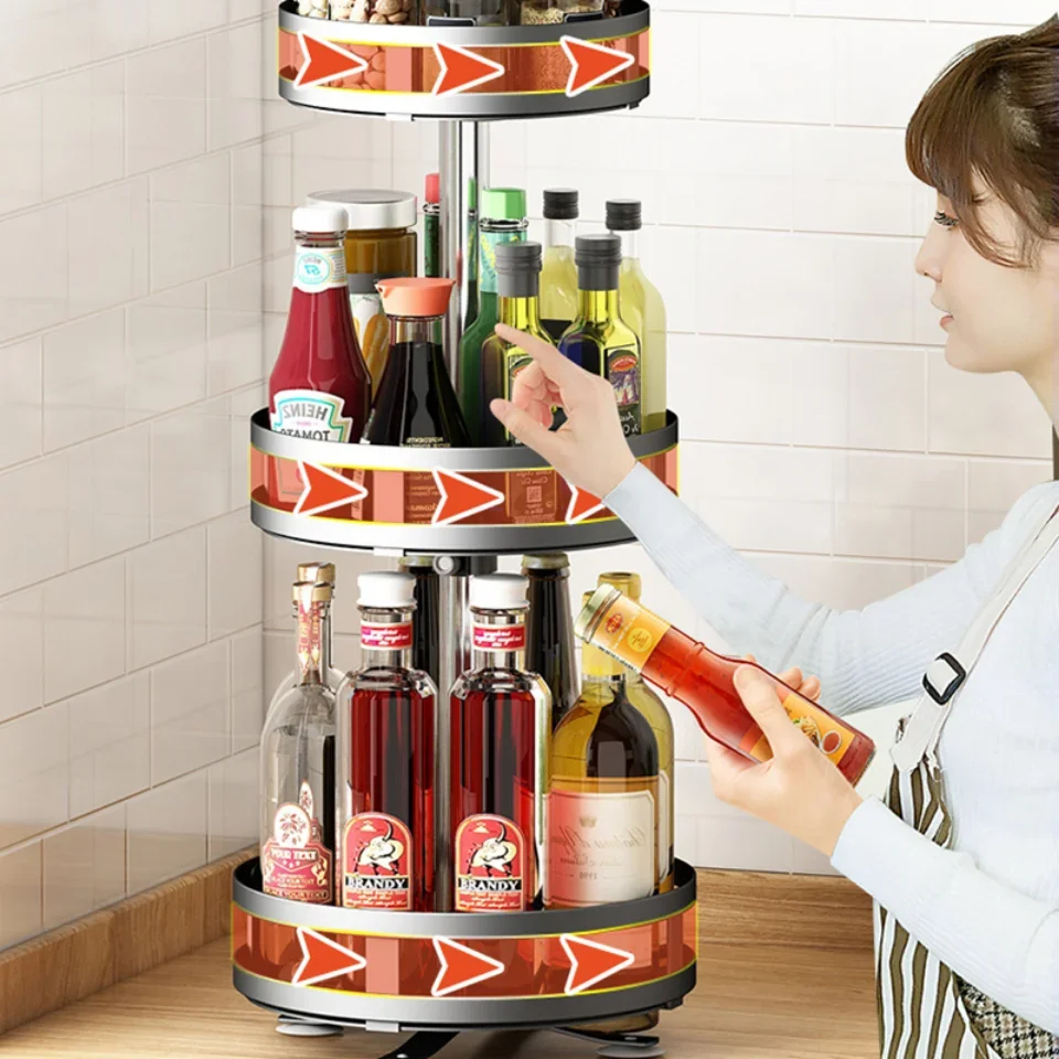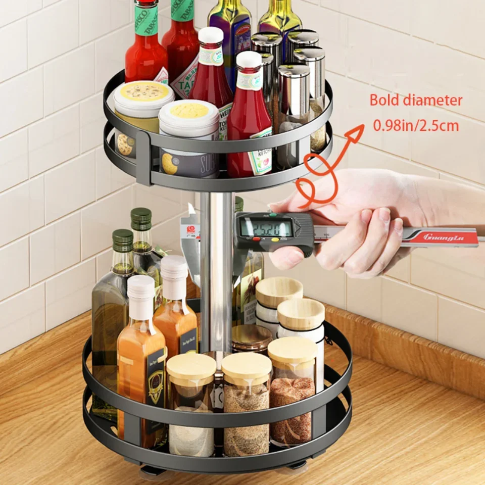 Both tiers of the rotating spice rack are organized with raised edges to prevent any items from slipping off. The two turntables of the lazy rotator rotate 360 degrees smoothly and silently, so no matter how many jars and other items you put on the two tiers of the rotating spice rack, they won’t fall off and cause a mess.