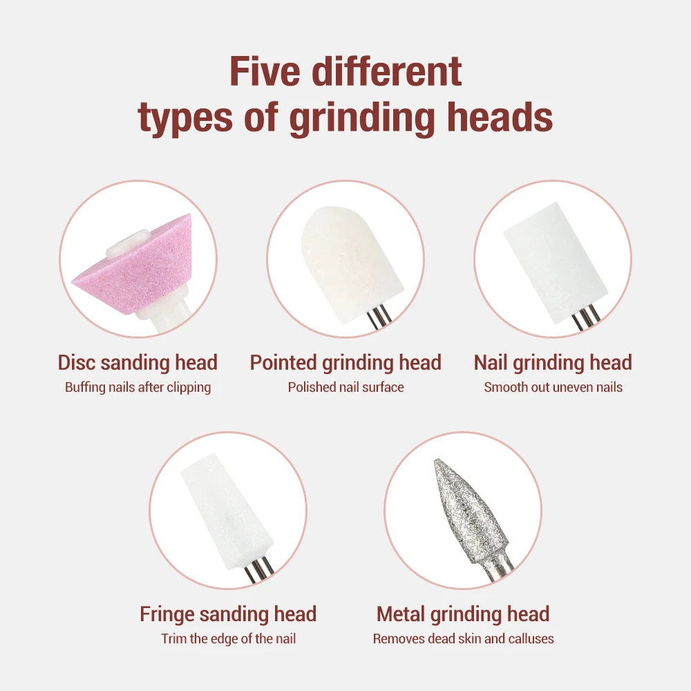 4. Equipped with five different types of replaceable grinding heads, you can choose from a variety of functions, allowing you to beautify your nails anytime, anywhere.