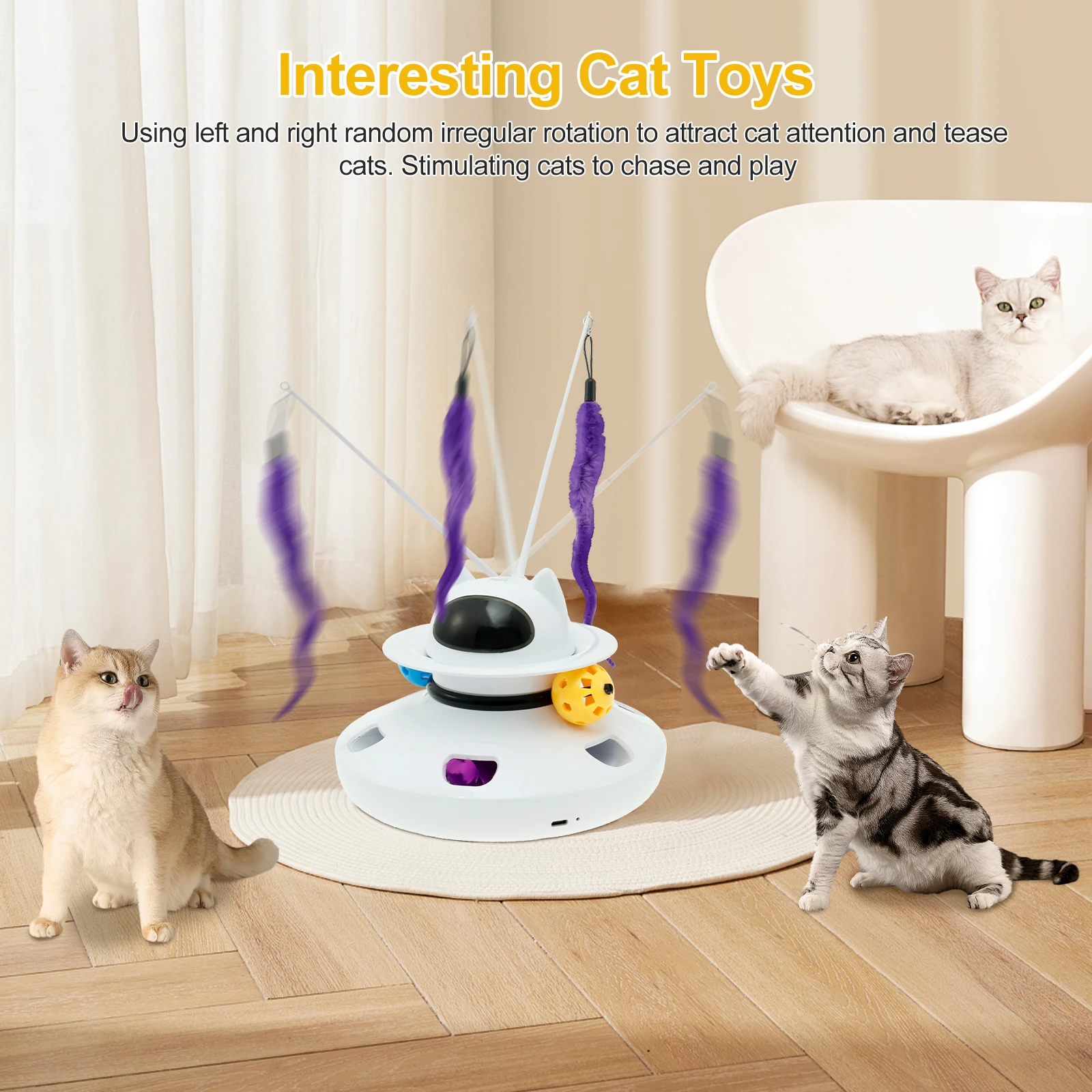 4 in 1 Cat Game Set: This product combines 4 popular cat game modes: cat teaser ball, flying feather, 3 colour LED cat teaser and electronic gopher game, providing rich entertainment experience for cats, suitable for indoor cat teasing scenes