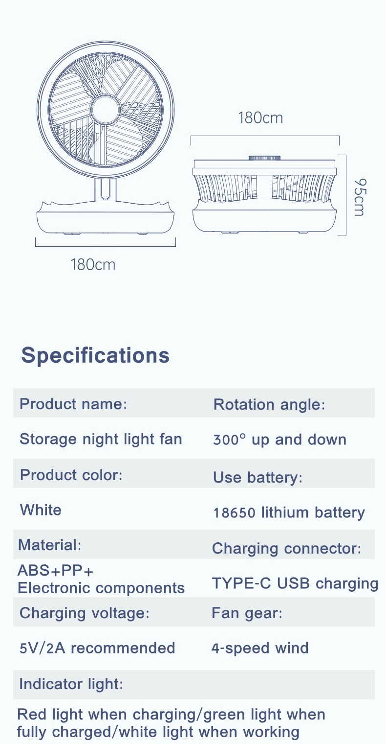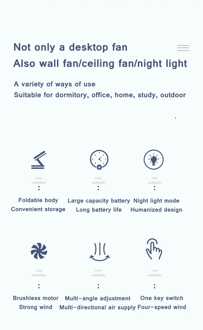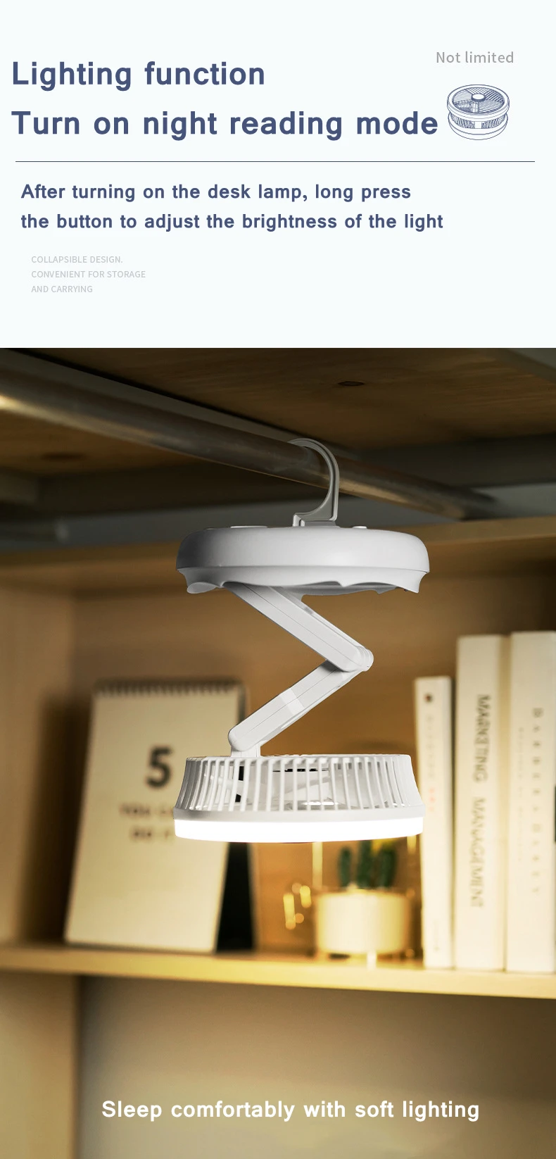Features: multifunction fan,wall-mounted,ceiling,standing and folding,with night lamp and pen holder functions,suitable for bedroom,office,study,dormitory,4 gears wind adjustable,large capacity battery for long endurance,brushless motor,silent and high wind blowing.