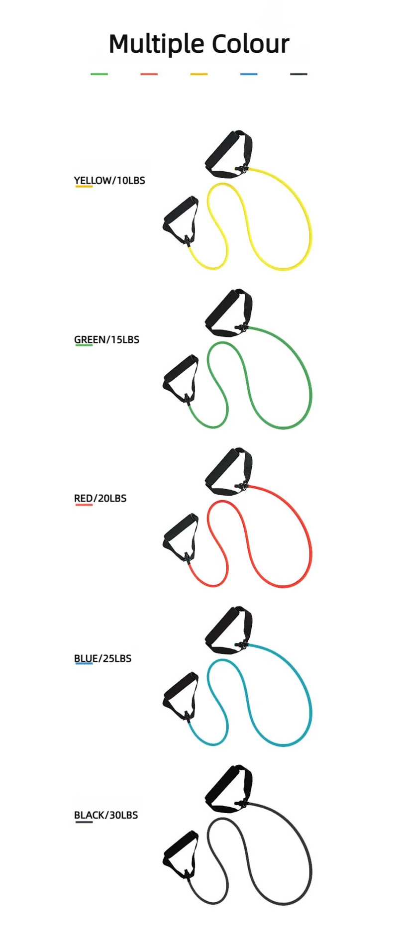 Black-30lbs; Green-15lbs; Blue-25lbs; Red-20lbs; Yellow-10lbs.