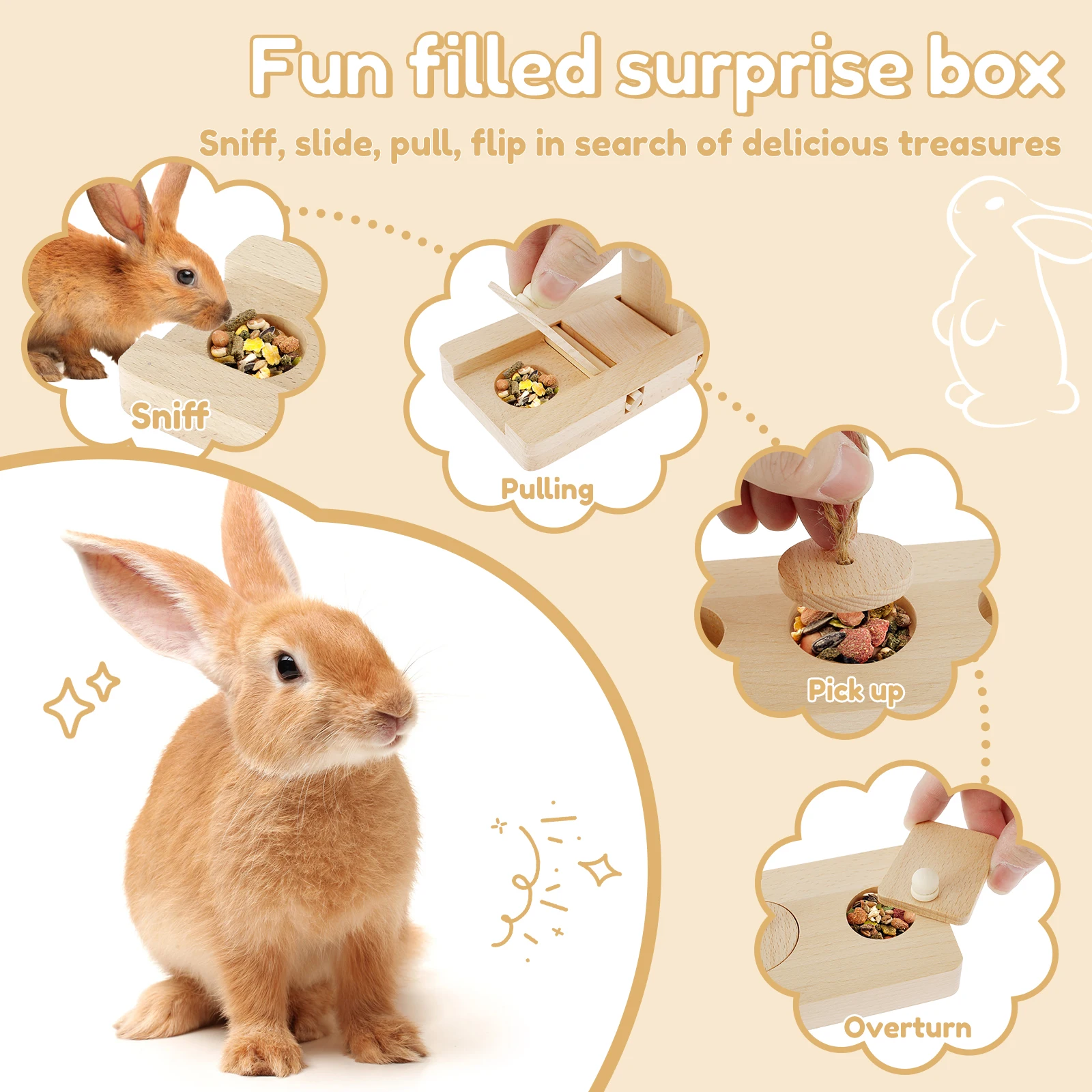 [6-in-1 Foraging Toys] This guinea pig toy is specially designed with six different types of grooves to provide hamsters with a variety of ways to forage for food. The lids of these alcoves can be opened by moving, lifting, sliding, and rotating motions, allowing your little pet to have an exciting and adventurous time while enjoying their treats.