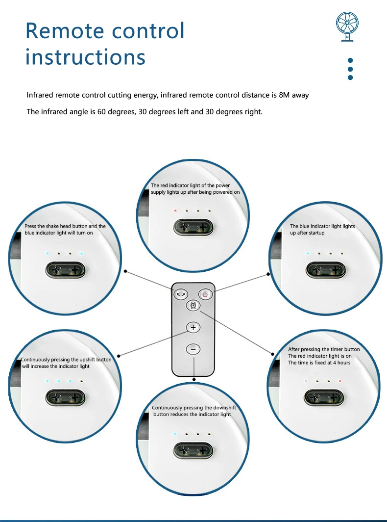 Timing can only be operated using the remote control. Press the “timing button” on the remote control, and the indicator light on the shaking head button will light up green. There is only one timing gear, which is fixed for 4 hours and can be turned on or off.