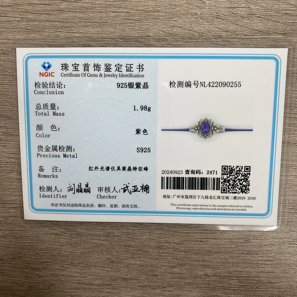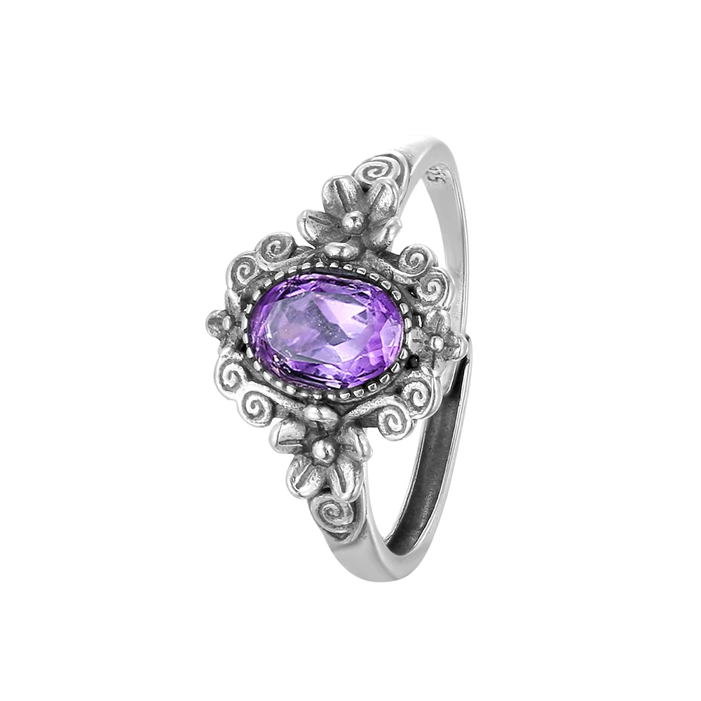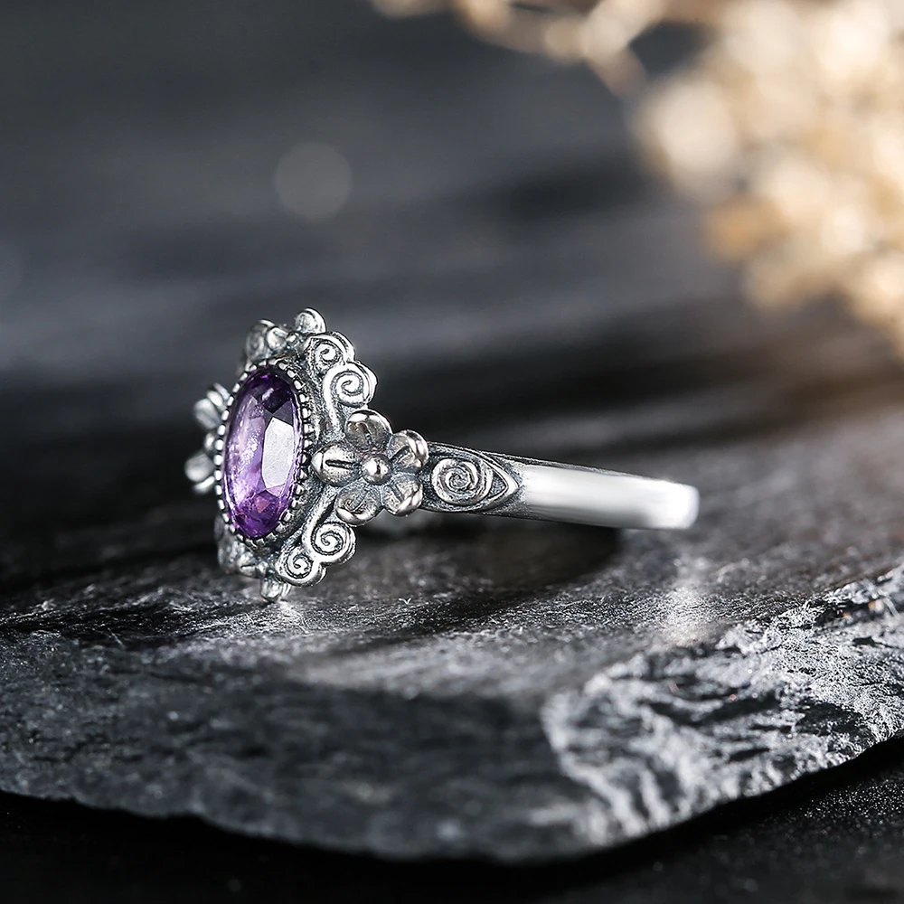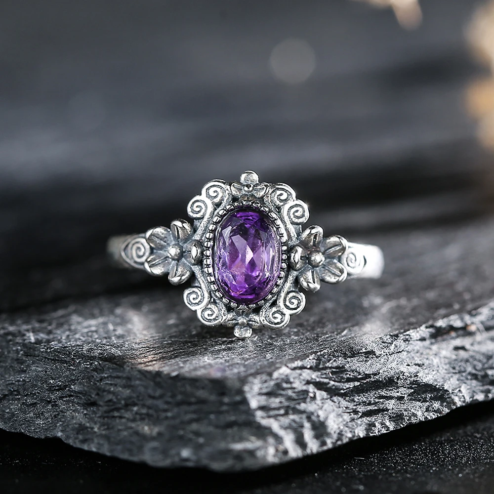 7*5mm Amethyst Natural Stone 925 Sterling Silver Women’s Ring Vintage Flower Shaped Adjustable Ring for Daily Wear Jewelry Gifts