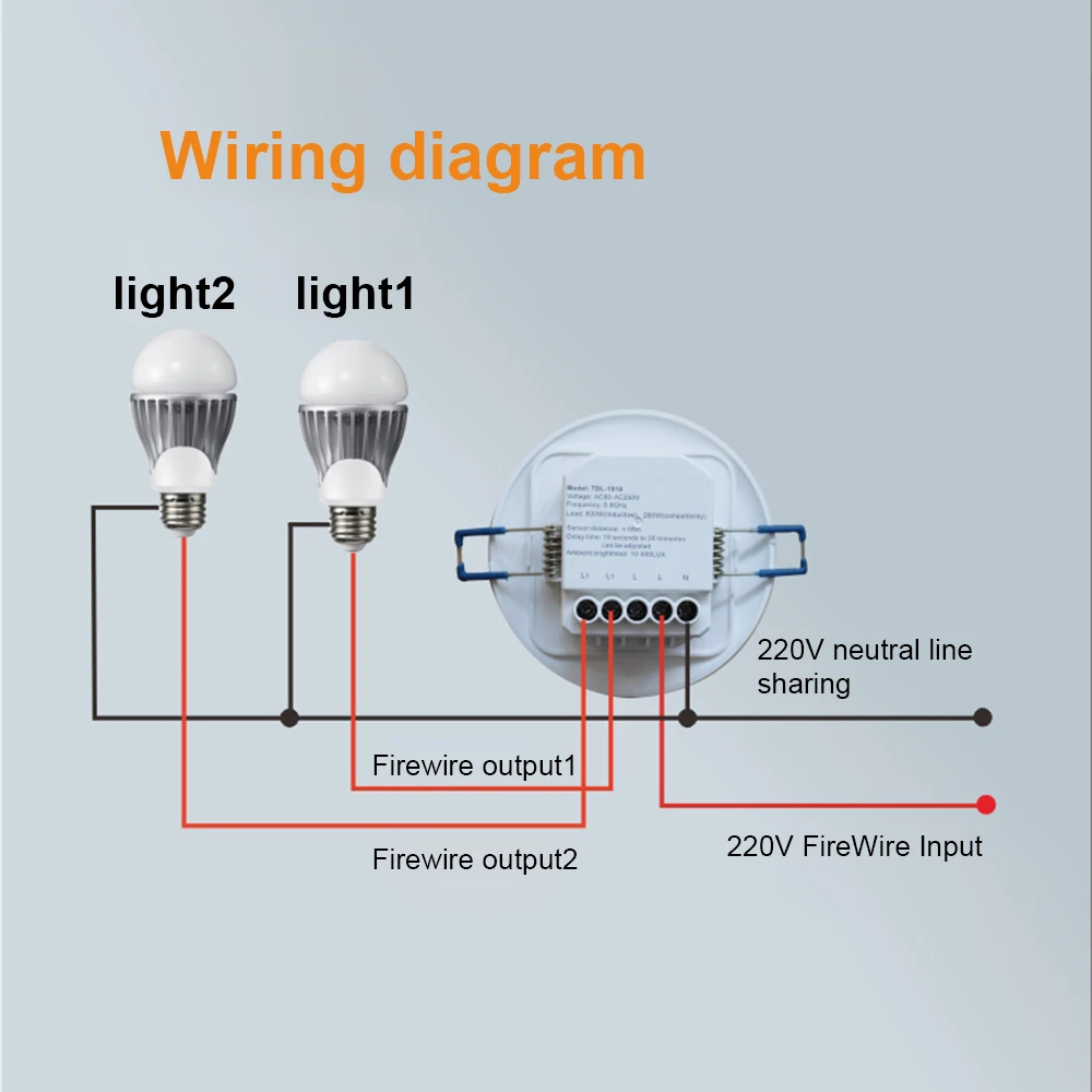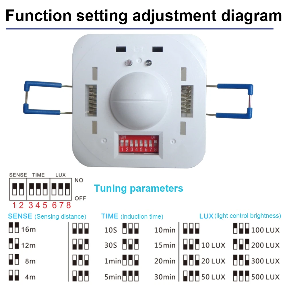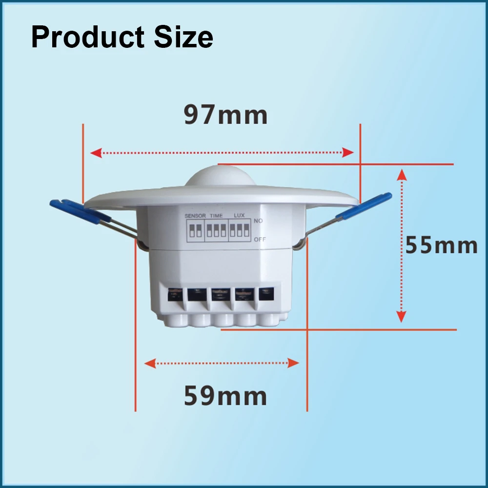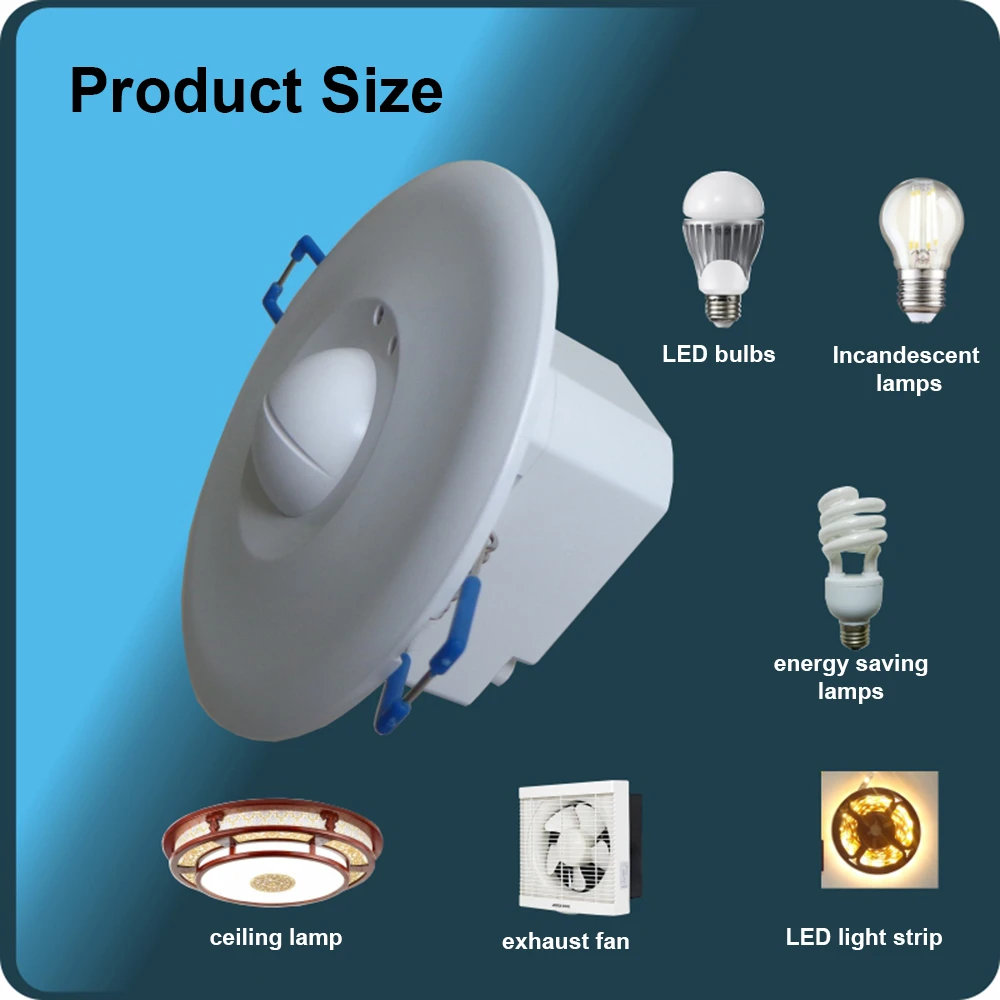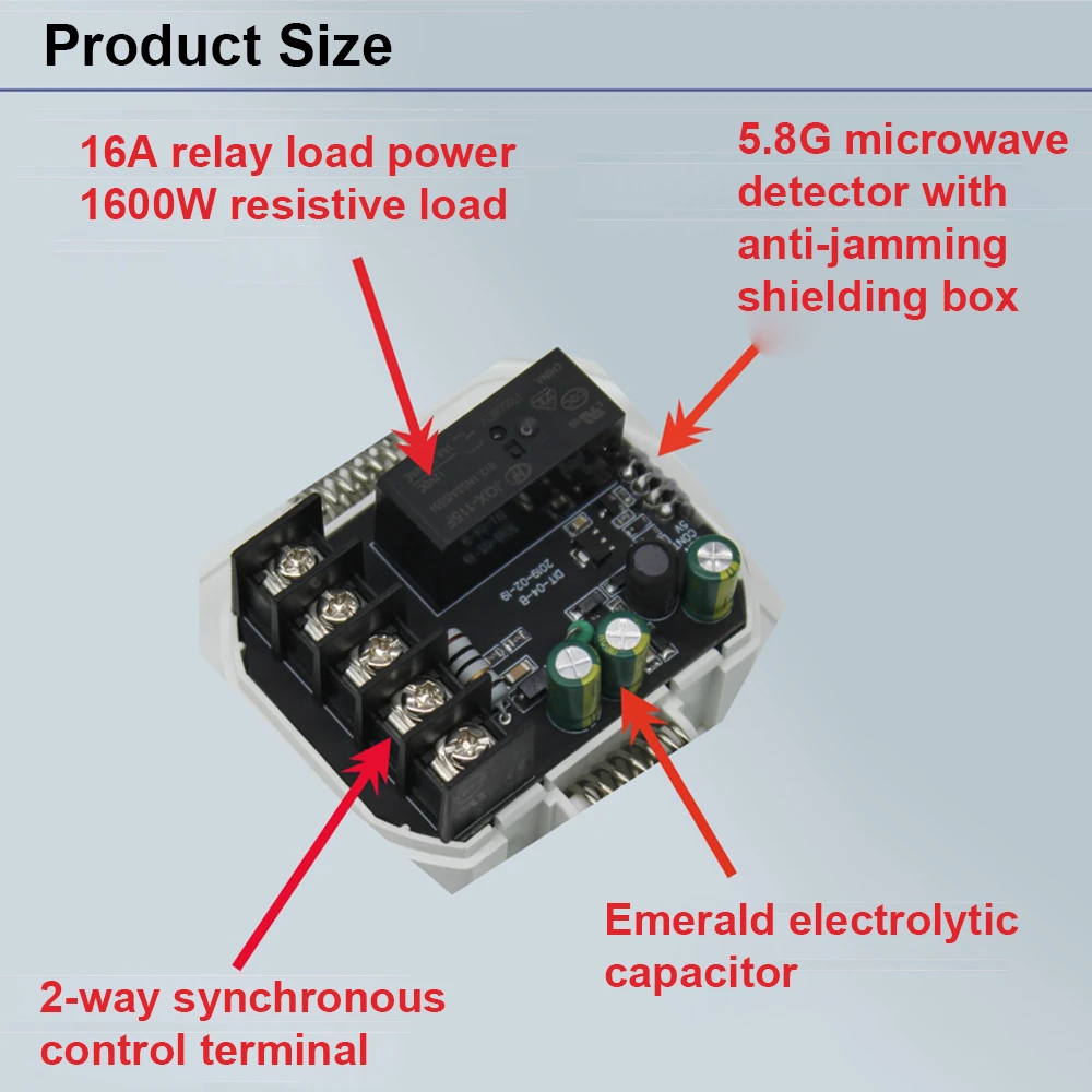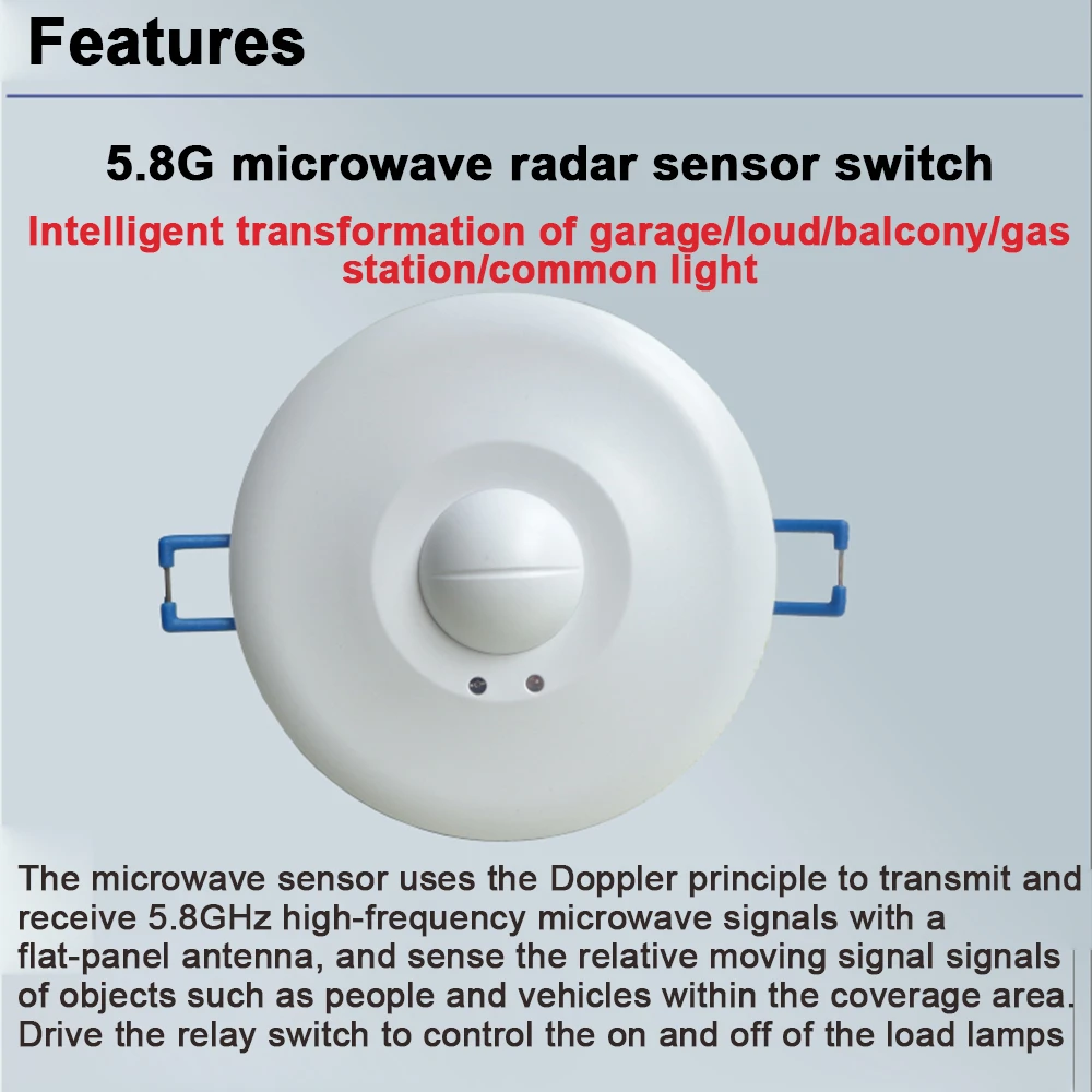 When someone walks into the sensor and meets the lighting requirement, the microwave switch is automatically turned on, the load electrical appliance starts to work, and the delay system is activated. As long as the human body does not leave the induction area, the load electrical appliance will continue to work. When the human body leaves the induction area, the sensor starts to calculate the delay, and when the delay ends, the sensor switch is automatically turned off, and the load electrical appliance stops working. Truly, safe, convenient and intelligent, energy saving.