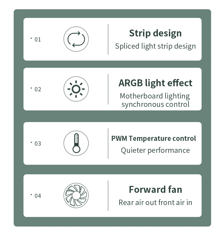 • RGB Lighting :The fan features 4pin PWM RGB lighting, adding a touch of style to your computer build.