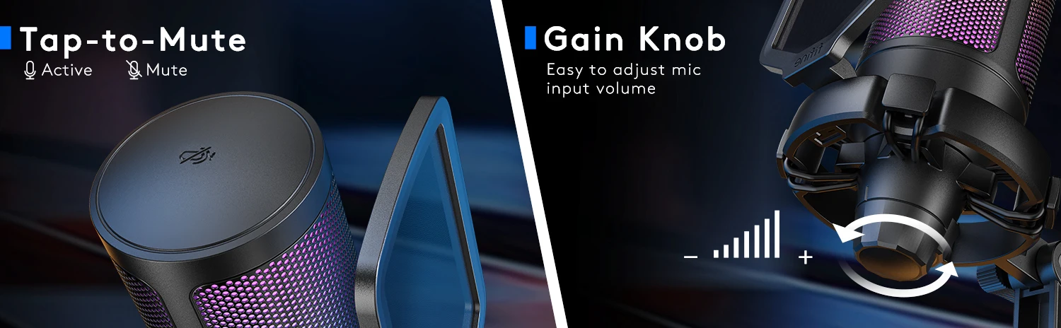 • Touch Mute Feature :The microphone features a touch mute control, allowing for quick and convenient volume adjustments during your recordings.