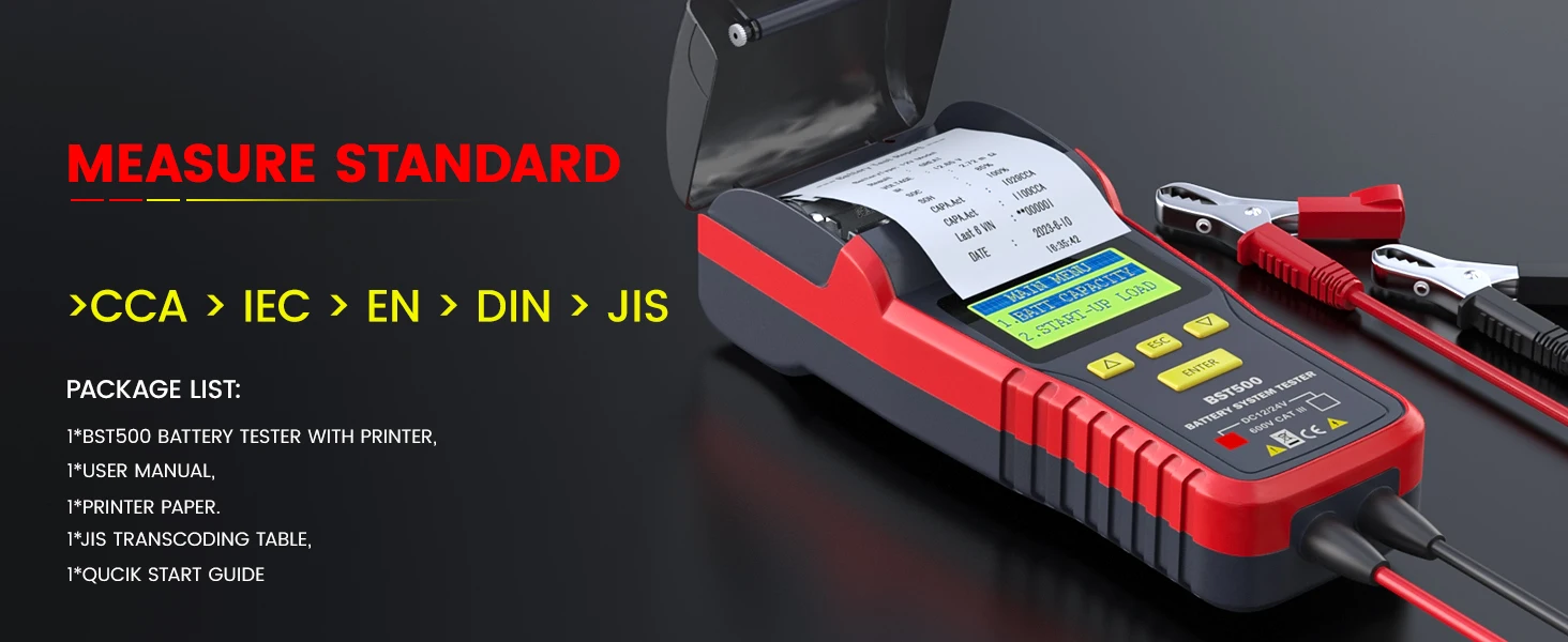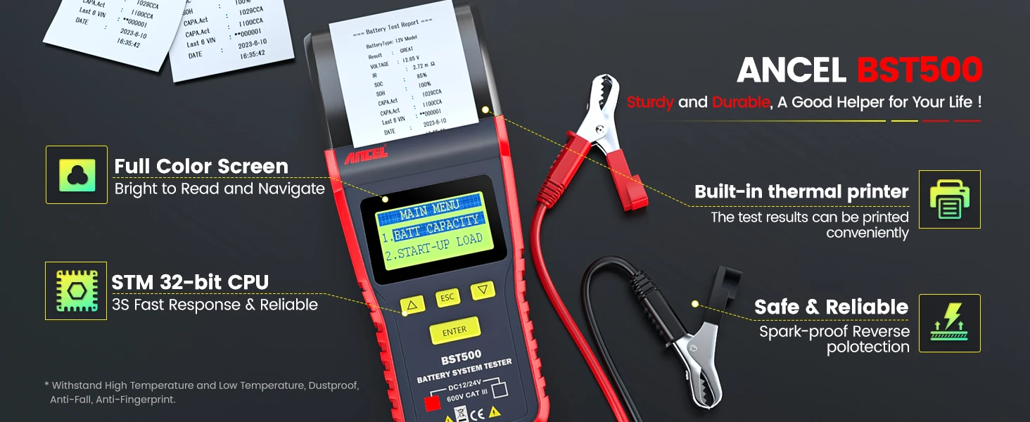 ANCEL BST500 Battery Tester Car 12V&24V Analyzer Systems with CCA,BCI,CA,MCA,JIS,DIN,IEC,EN,SAE,GB,Print Test Report Fast.