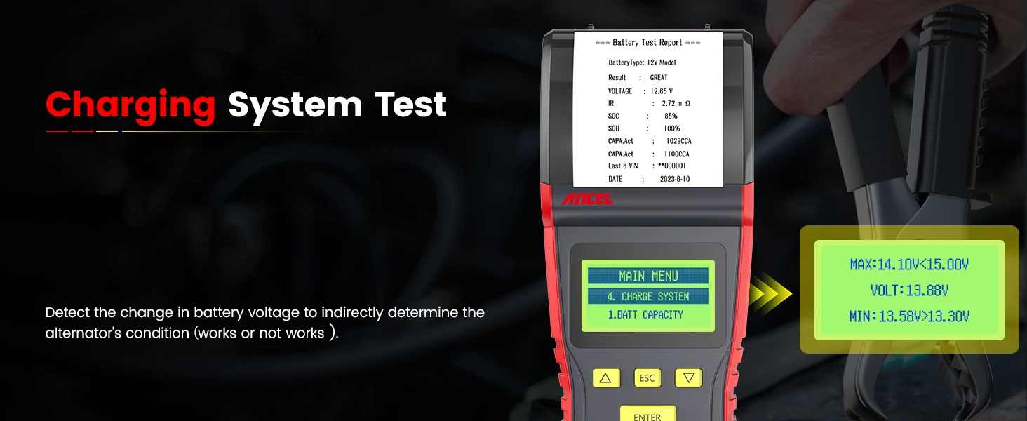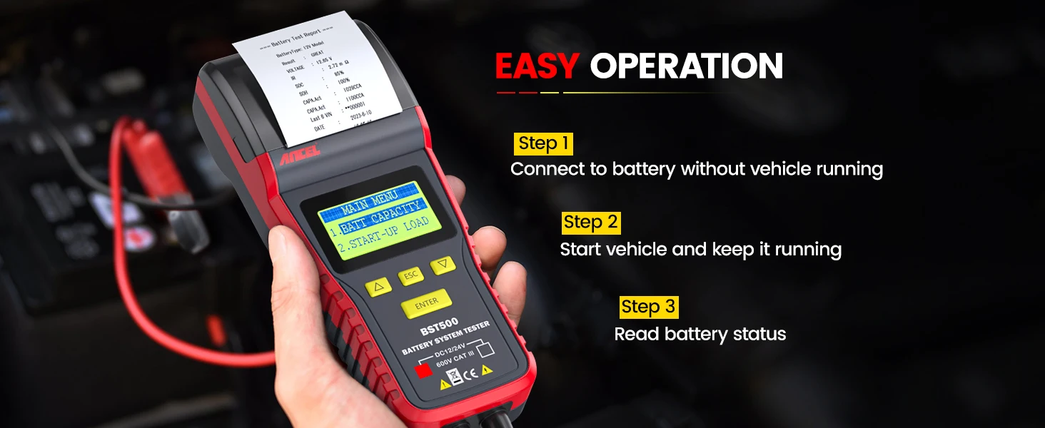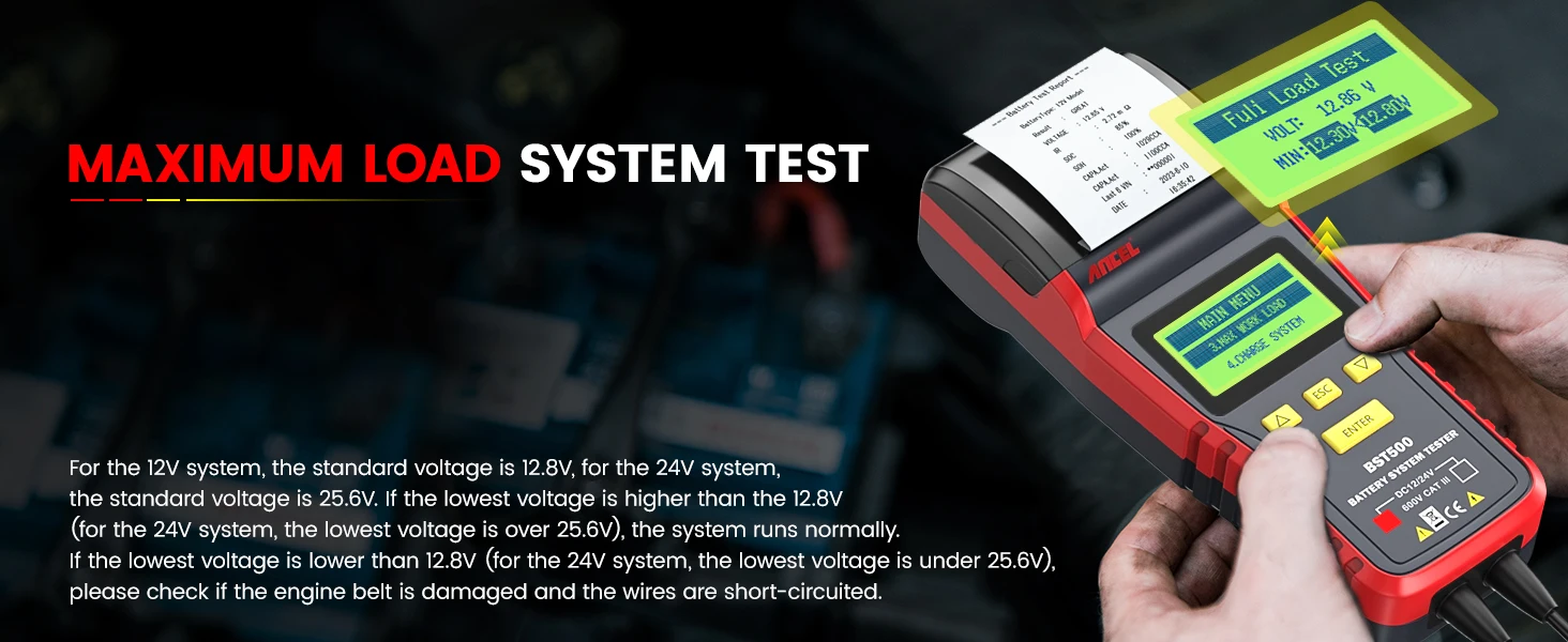 ANCEL BST500 alternator tester is suitable for all 12V and 24V lead-acid batteries with battery capacities from 100 to 2000 CCA, such as cars, motorcycles, trucks, rv, atv, suv, boats, yachts, lawn mowers,ext. ANCEL BST500 battery testers can perform a variety of tests: Voltage Measurement, Battery Internal Resistance Measurement, Battery Status of Health, Battery Status of Charge, Start-up Cranking Load Test, Maximum Load Test, Charging System Test ext.
