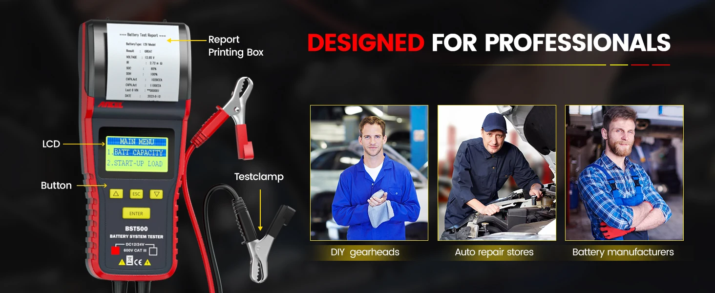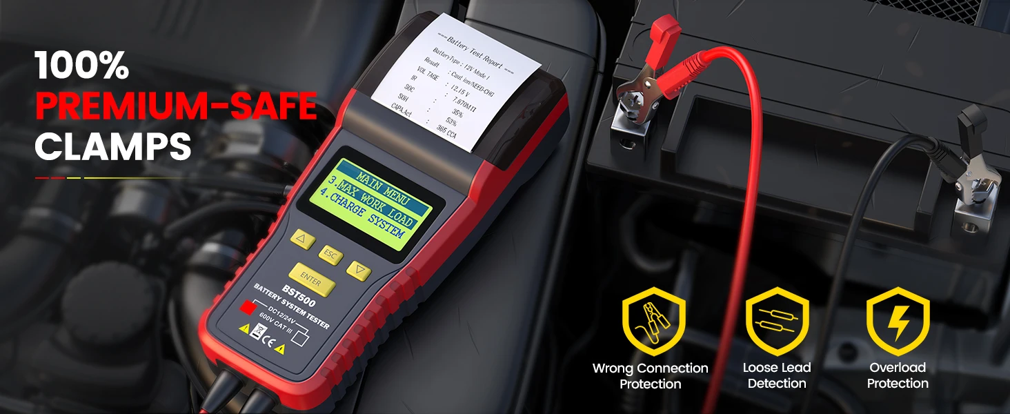 The BST500 auto battery tester allows you to test both on-board and off-board batteries, Simply connect the tester’s clip to the battery, then it will turn on and be ready to test and analyze the battery and print the test results, it’s that simple!BST500 battery analyzer Making it great for auto stores, garages and DIY users who check their batteries on a regular basis. A great choice for gifts for fathers, brothers, uncles, etc.