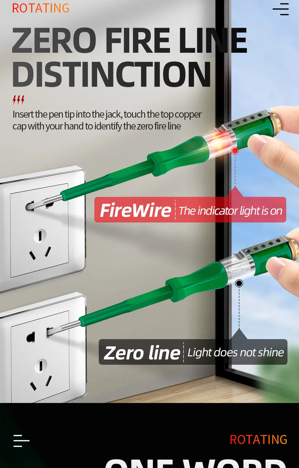 (2) Product Introduction: Insert the pen tip into the jack,touch the top copper cap with your hand to identify thezero fire line – Live wire indicator light – Zero line light does not glow