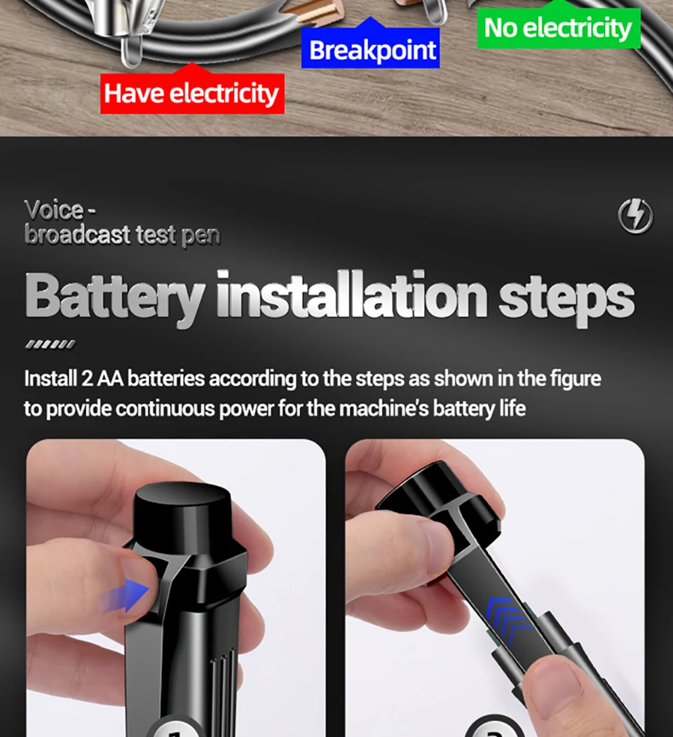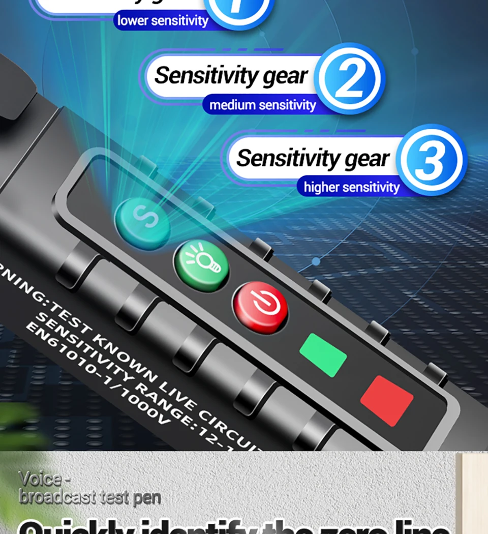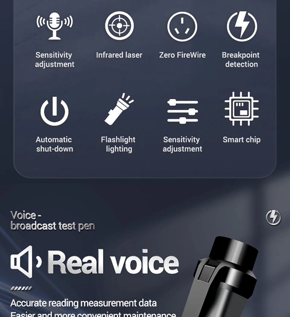 | NCV sensitivity indication method | The tester indicates the detected high-voltage or low-voltage electric field through voice broadcast, alarm sounds of different frequencies and LED lights of different colors |