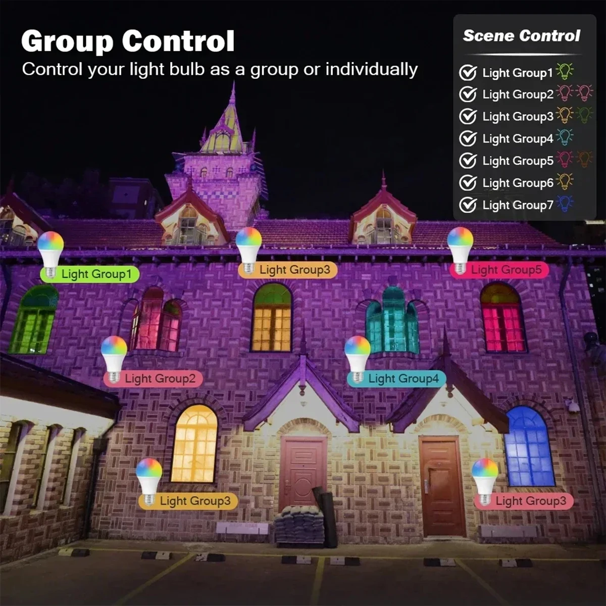 3. Remote and group control: Continue to connect this WiFi smart light bulb to your home network (only supports 2.4GHz WiFi), and you can remotely control the smart light bulb on your smartphone when leaving home. The group control function allows you to simultaneously control multiple smart light bulbs for scene settings.