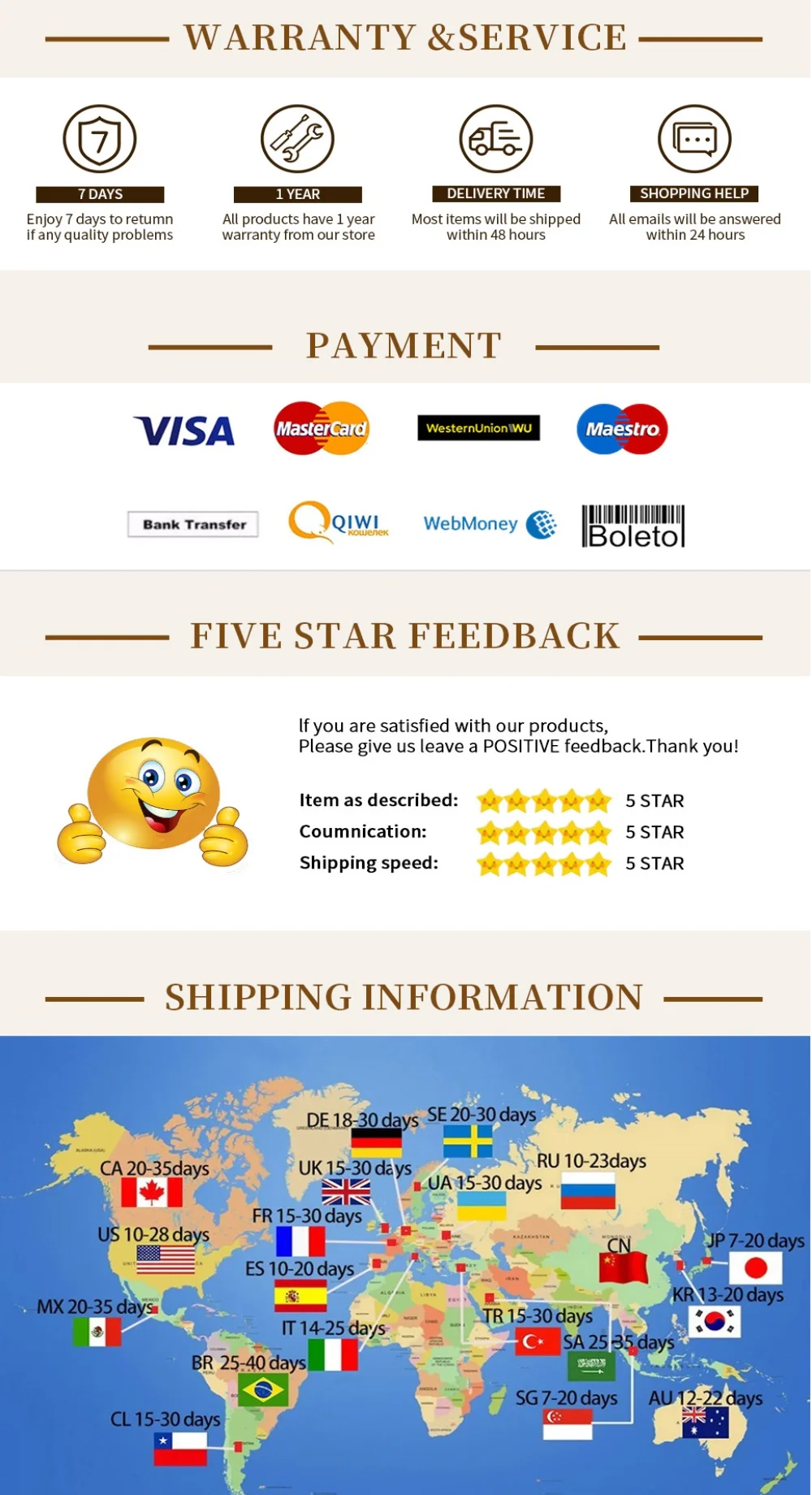 Orders are shipped by EMS or USPS. Typically, delivery takes 5-20 working days after dispatch, but it may take longer due to factors beyond our control.