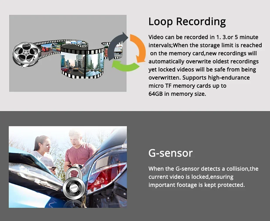 3-axis G-Sensor senses sudden acceleration, braking and collisions in order to automatically capture and protect critical footage surrounding an accident.