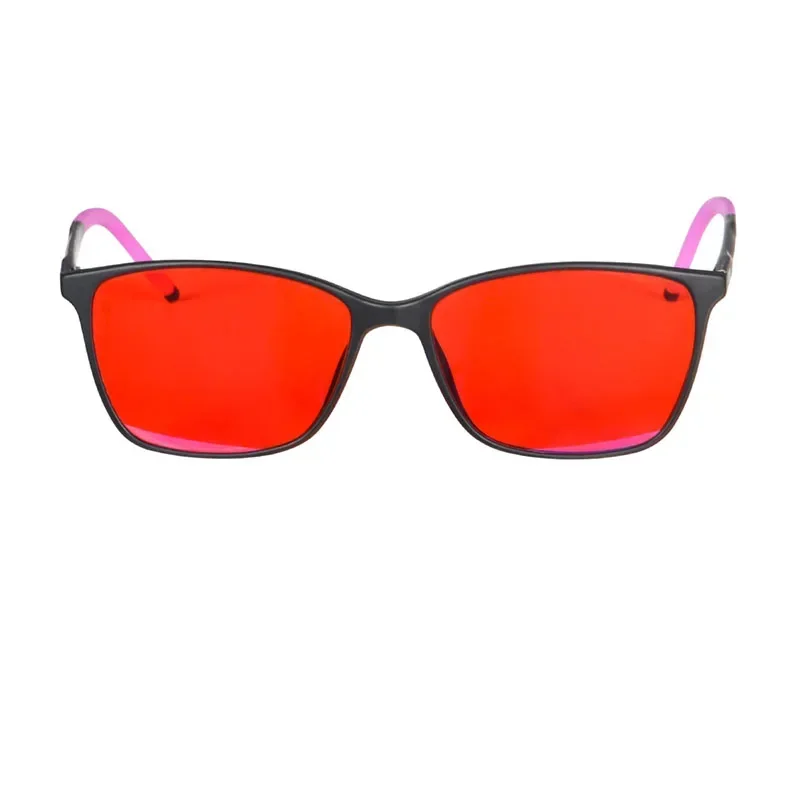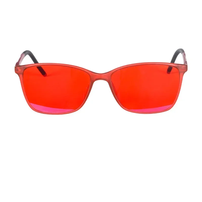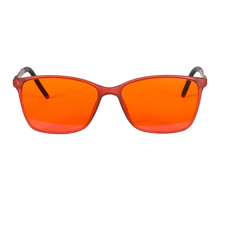 red lenses glasses block close to 100% of both blue and green wavelengths. While many glasses block only blue light, recent studies have shown that lower wavelengths also have a significant effect on sleep patterns. We block all wavelengths below 550 nm, which includes blue, green and violet.